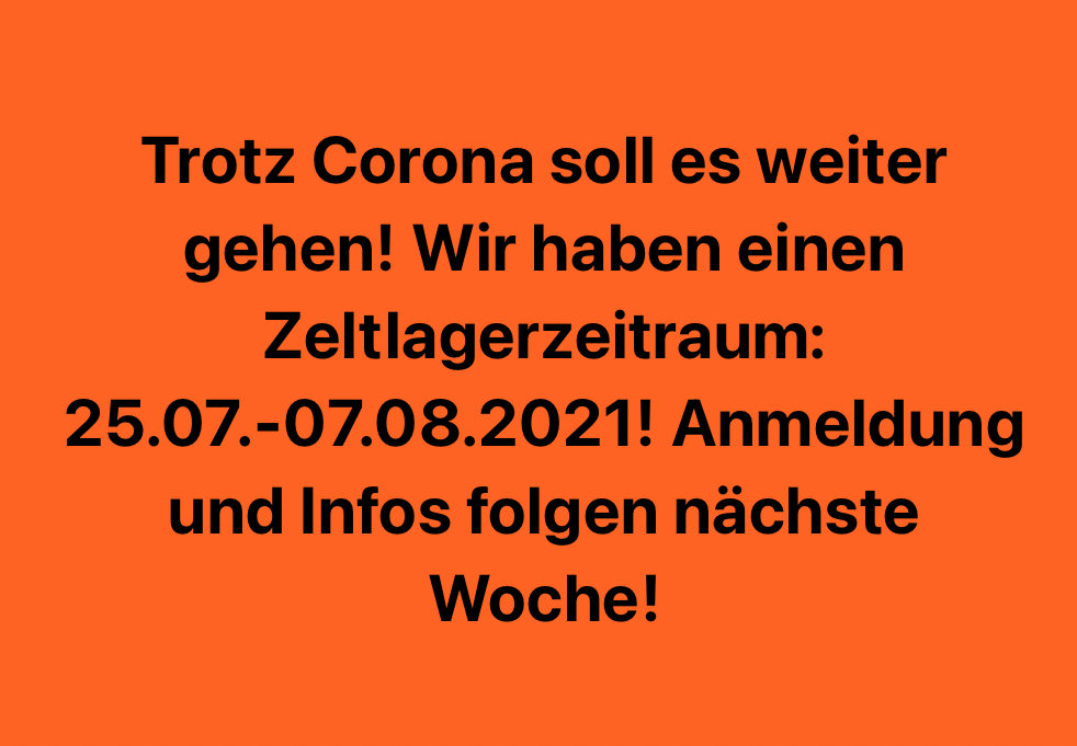 wir haben uns in Rücksprache mit unserem Team dazu entschieden unser Zeltlager in diesem Jahr in Vreden durchzuführen. Das heißt: Wir wagen es zu planen, soweit es geht. Abhängig ist das ganze natürlich im Endeffekt von der Entwicklung der Pandemie, da die Lage ja noch sehr unübersichtlich ist. Falls das Zeltlager nicht stattfinden kann fallen keine Kosten an und es wird ein Ersatzprogramm in Drolshagen geben. Die Kosten und Anmeldung für die Programmpunkte, die es dann in Drolshagen geben würde, werden in dem Fall dann kurzfristig durchgegeben.