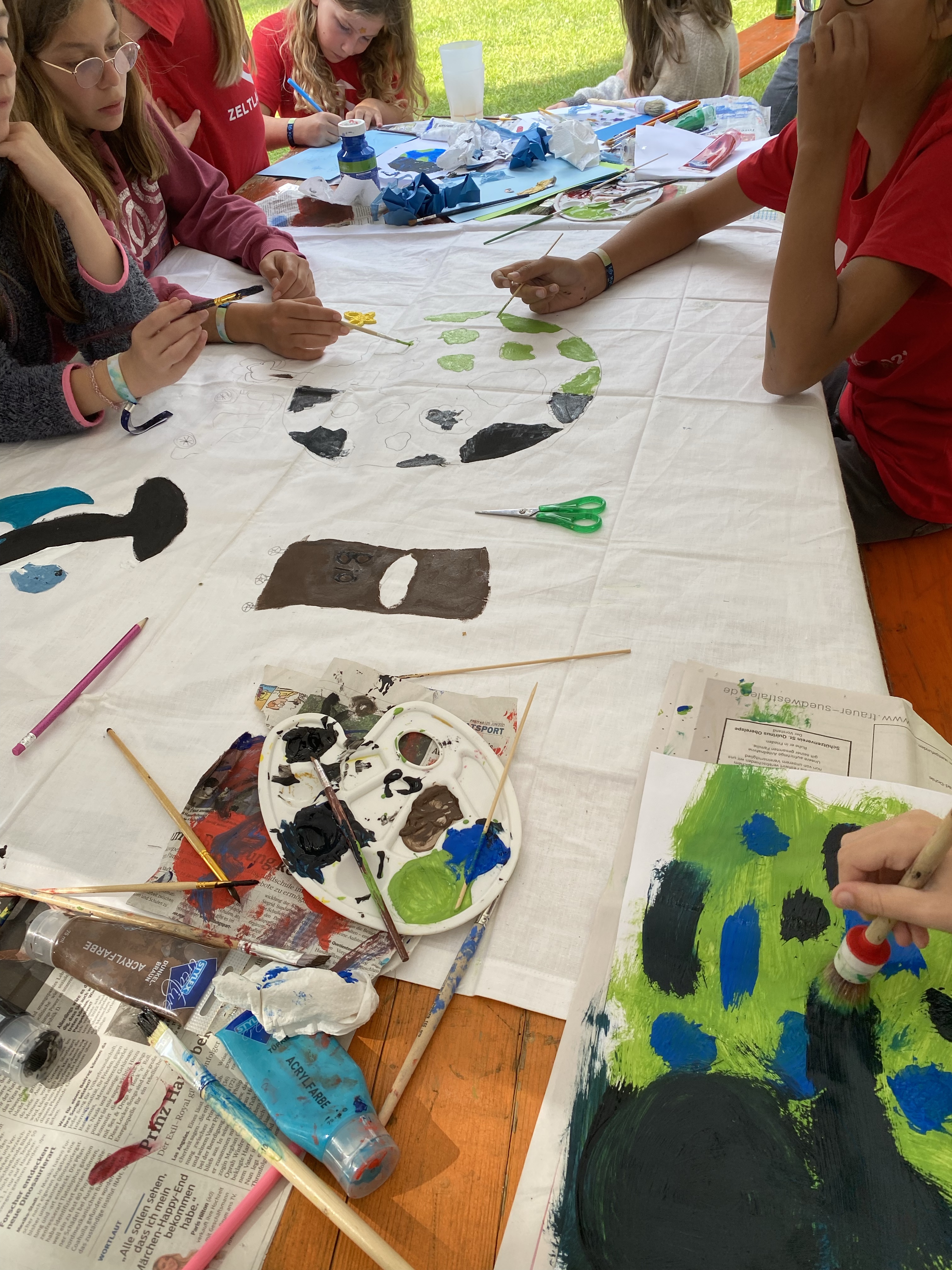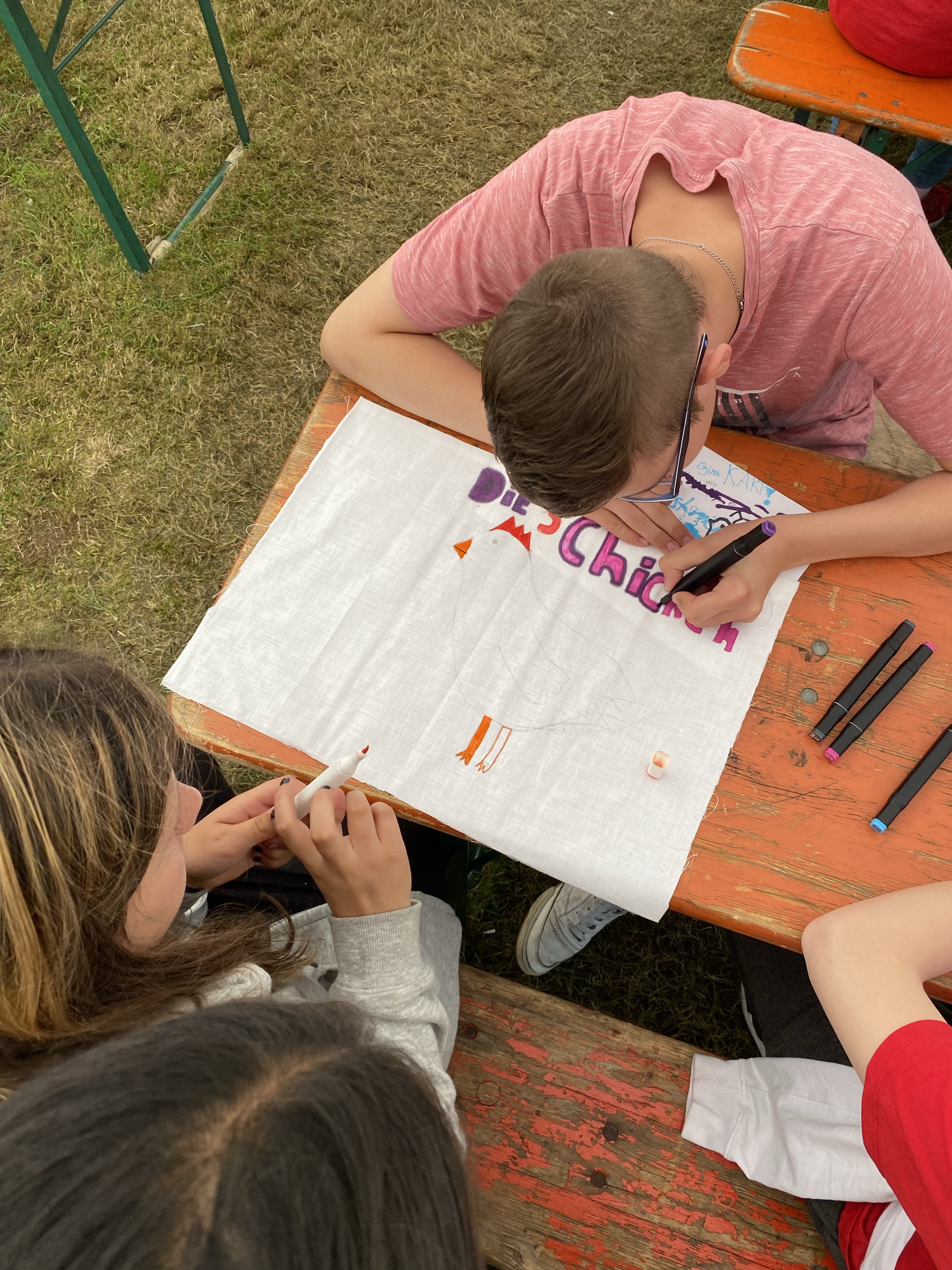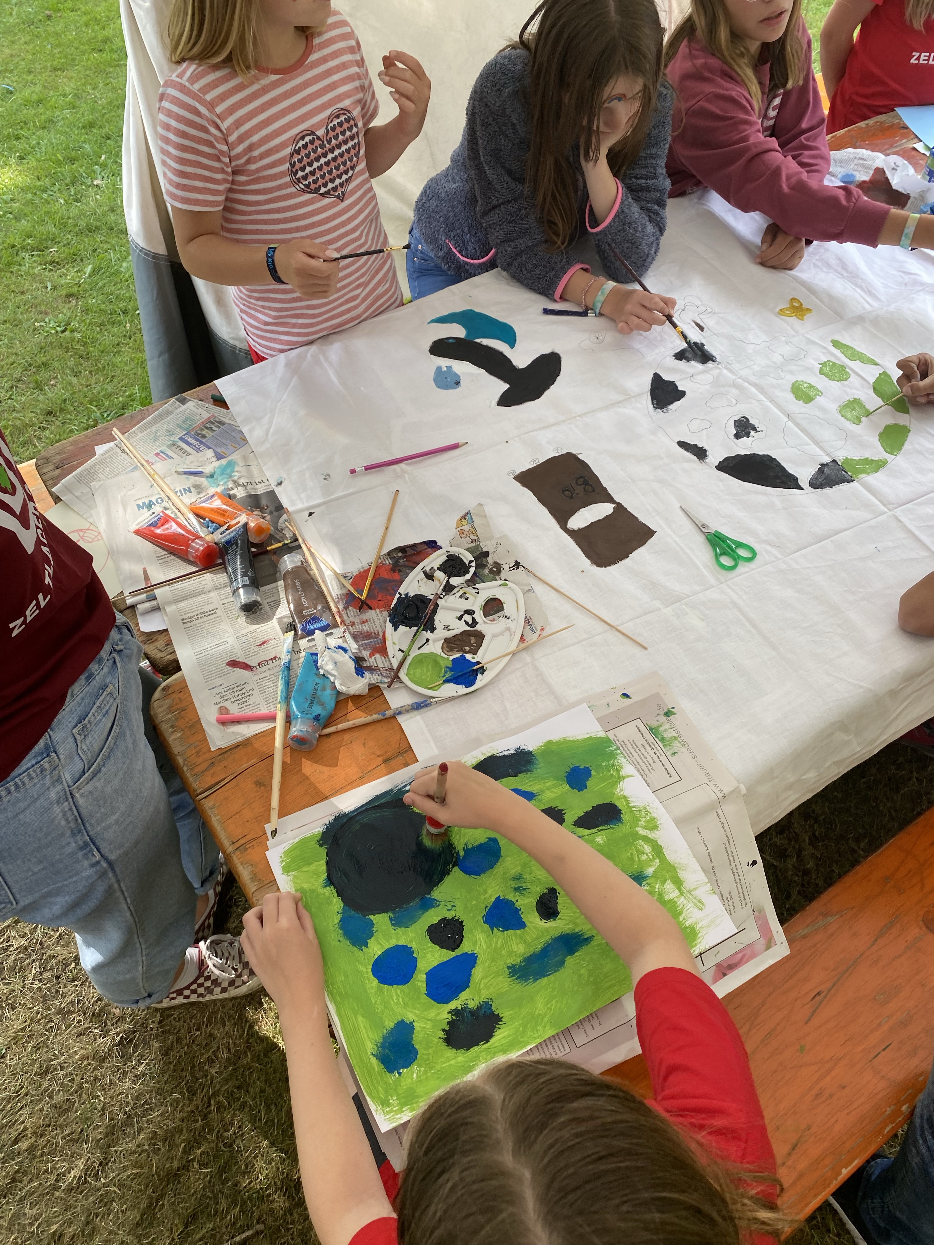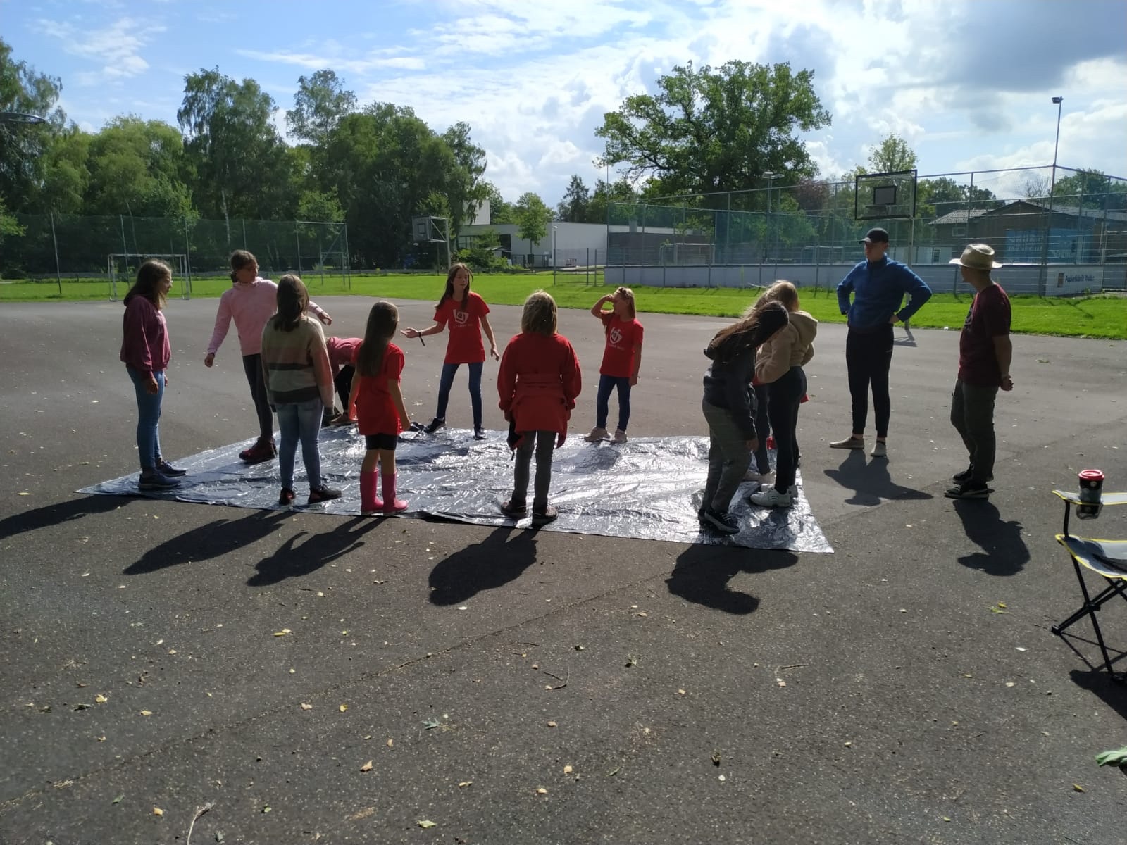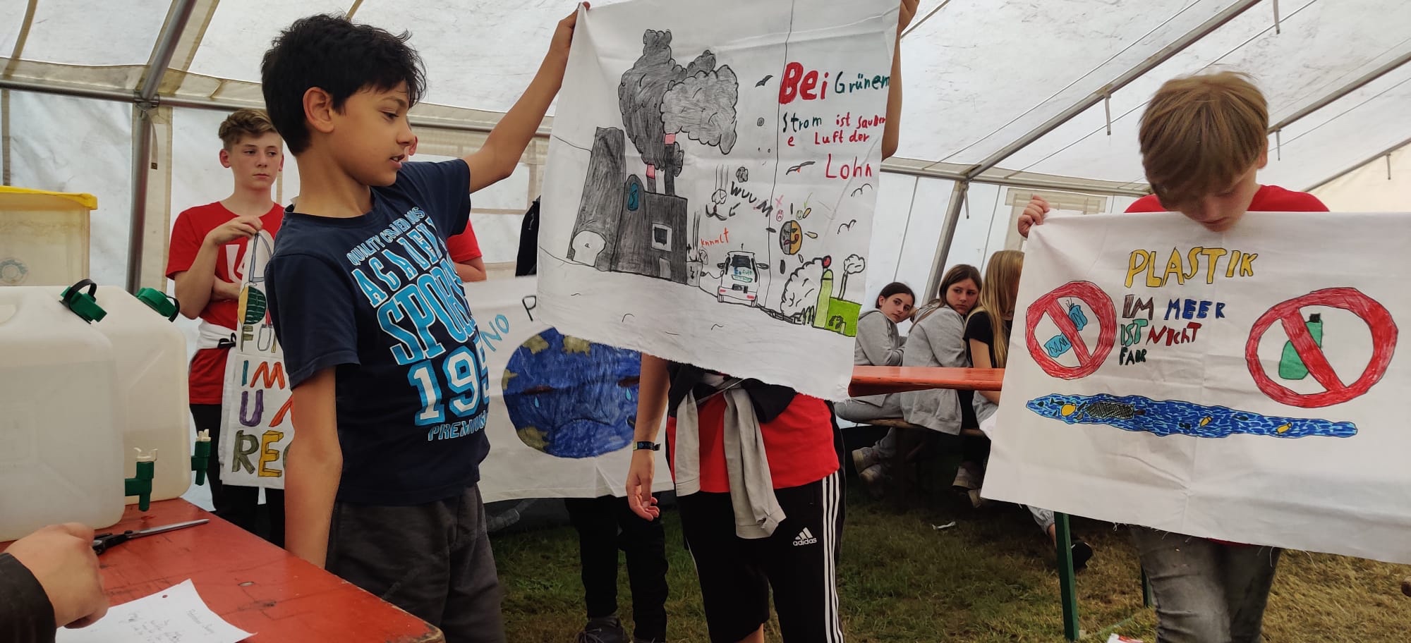 Also wurden die Kinder direkt mit einer Demonstration am Frühstückstisch begrüßt. Schon gestern Abend haben wir heimlich Schilder beschriftet, mit denen wir heute Morgen aus dem Küchenzelt marschierten. „Ich bin so sauer, ich hab sogar ein Schild dabei“, „Kurzstreckenflüge nur für Insekten“, „Rettet die Wale, findet Nemo“ oder „No Planet B“ stand da drauf. Die Kinder waren sichtlich amüsiert und interessiert, genau das war unser Ziel. Nach dem Frühstück und den Diensten ging es los mit dem ersten passenden Spiel. An verschiedenen Stationen, die über den Platz verteilt waren, gab es verschiedene Aufgaben für die Kinder: Müll sortieren, Blättersuche, ein Quiz und ein Eisschollenspiel.