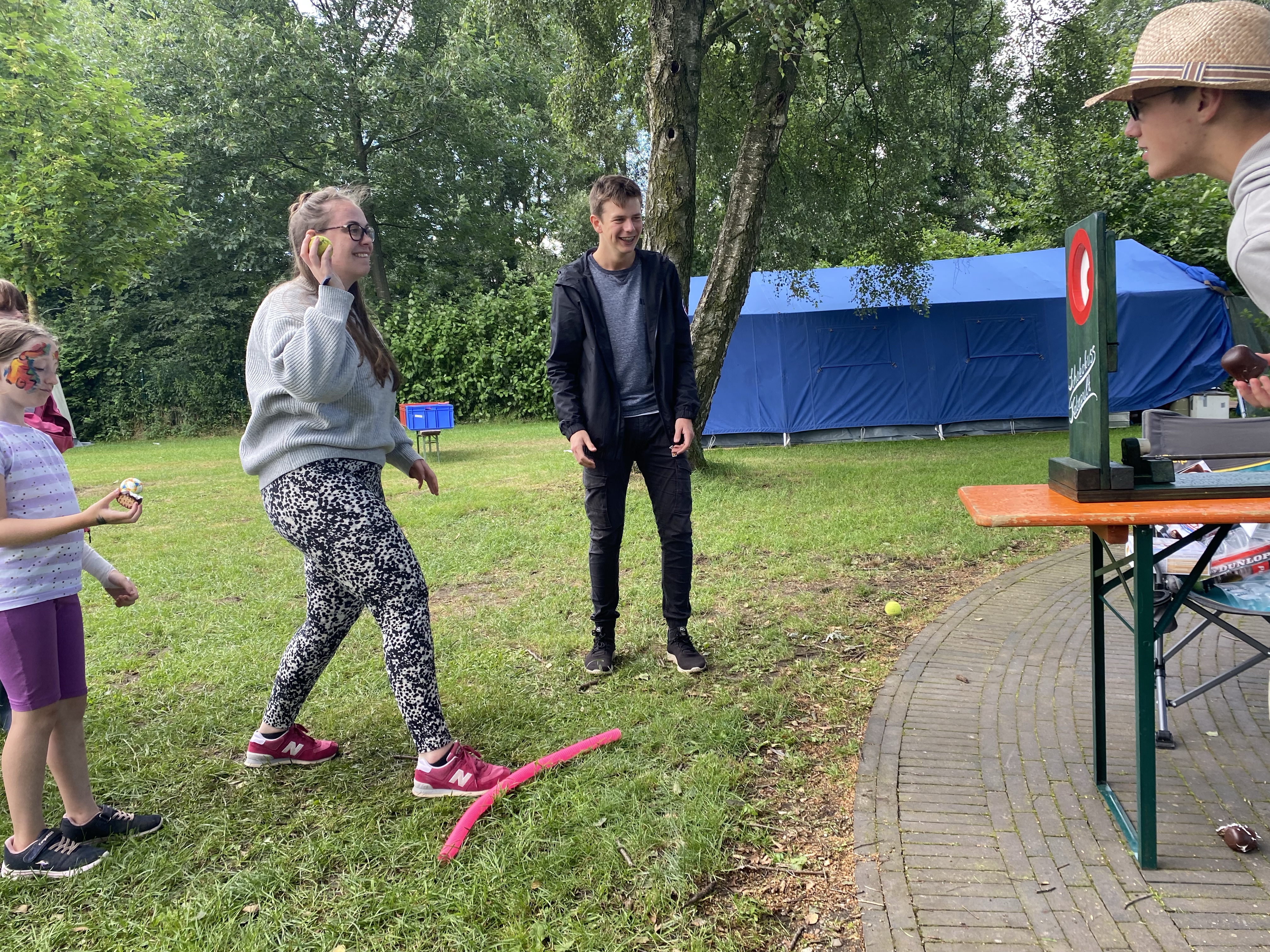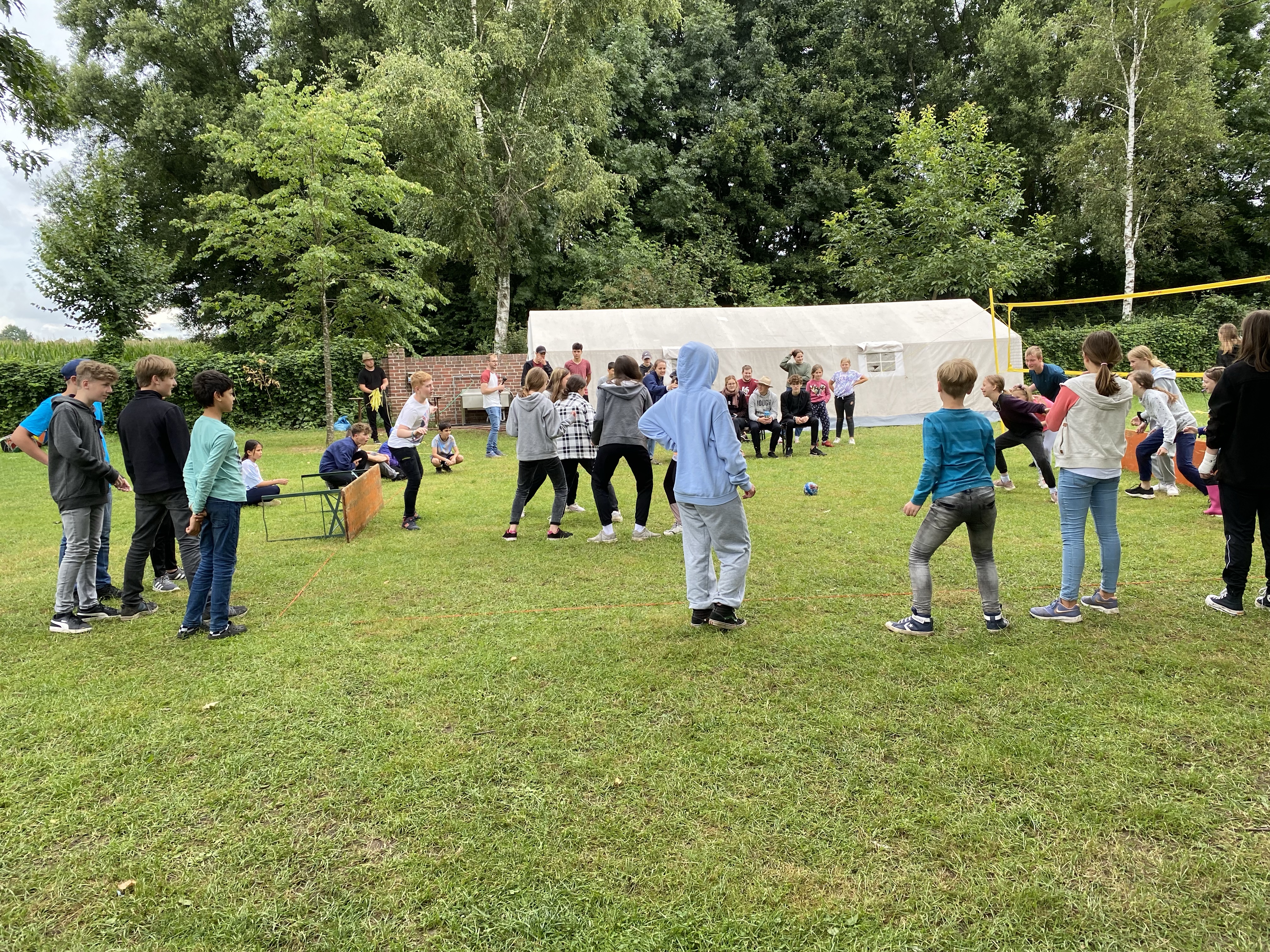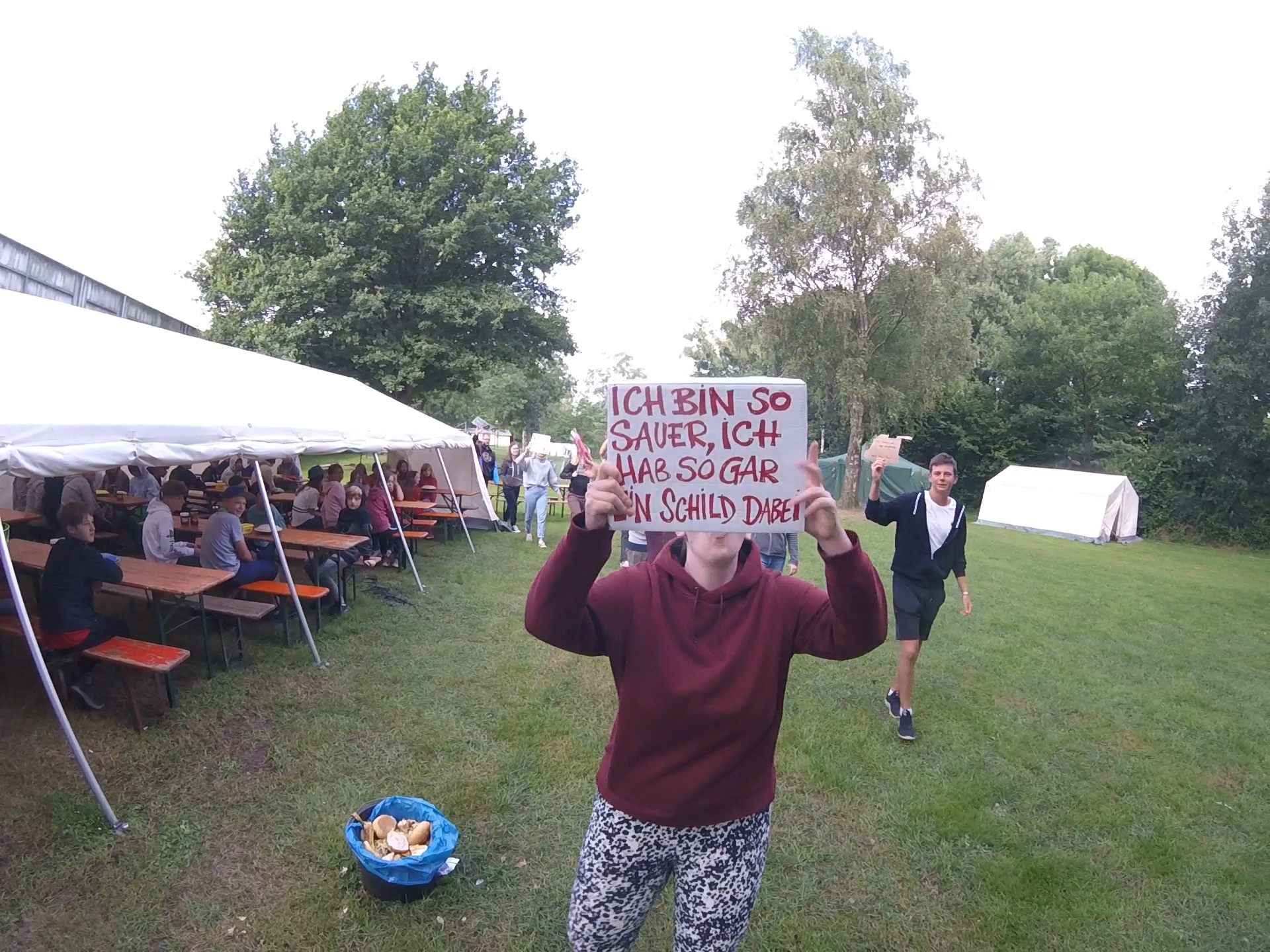 Gestern gab es ja schon einen kleinen Vorgeschmack mit dem Erntefest: heute war Kirmestag! Nach dem Frühstück und den Diensten machte uns das Wetter erstmal einen Strich durch die Rechnung. Auch ungewohnt…. Wenn ich an unsere letzen Zeltlager zurückdenke, bei denen wir wegen der Waldbrandgefahr nicht mal Feuer machen durften. Dieses Jahr ist halt einfach alles anders. Nasser. Aber das Münsterland hat durch die fehlenden Berge seine Vorteile, hier zieht alles schnell durch. Also konnten wir irgendwann doch mal mit dem Programm starten. Als erstes Spiel Ballontreten: jedes Kind bekam einen Ballon an den Fuß und musste versuchen die der anderen kaputt zu machen, bevor der eigene Kaputt war. Hinterher endete es in einem langwierigen Duell, bei dem Timo S. gewann. Danach folgte das Kuhspiel, welches ein bisschen wie das Kartellspiel. Ziel war es alle Kühe mit Wasser zu versorgen ohne vom Jäger aufgehalten zu werden.