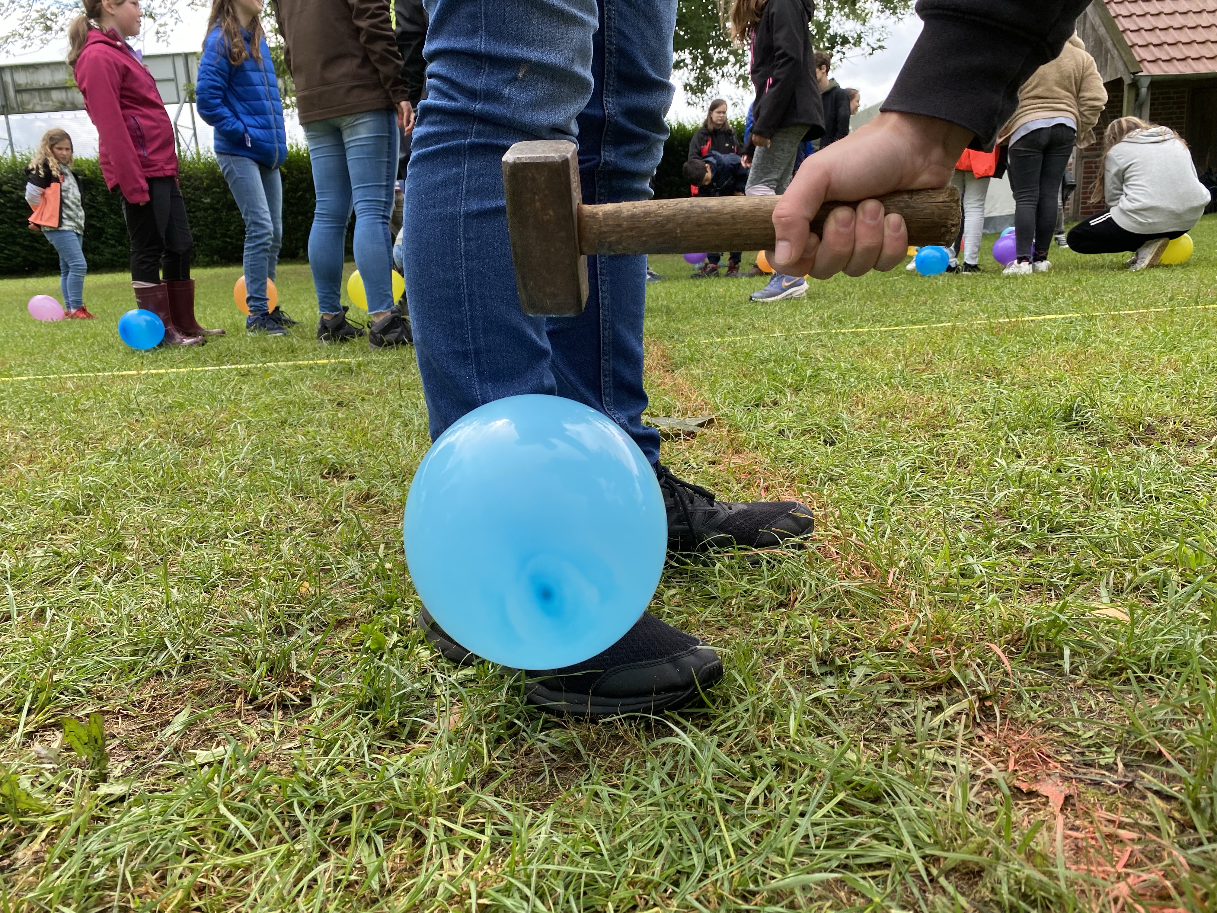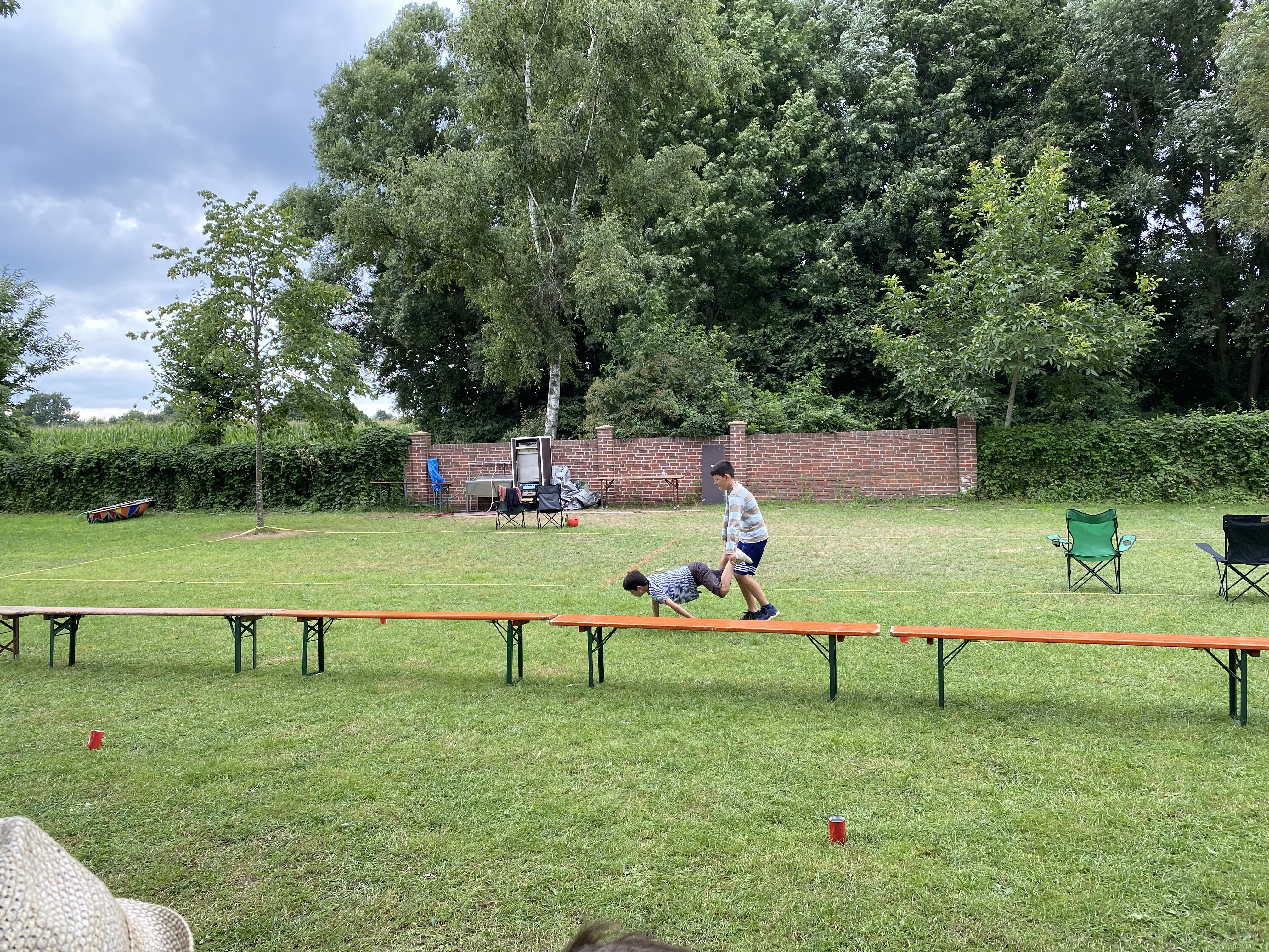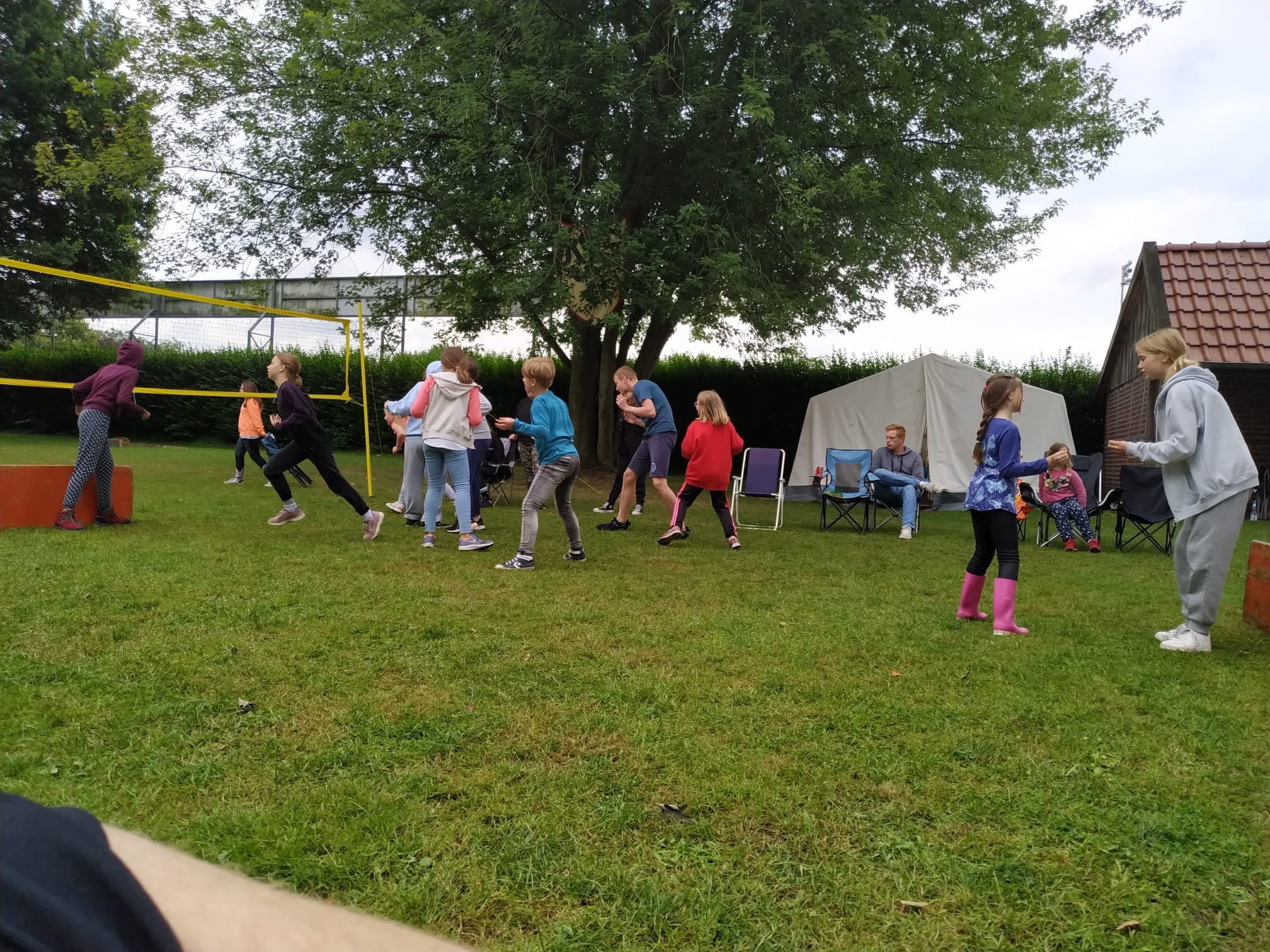Gestern gab es ja schon einen kleinen Vorgeschmack mit dem Erntefest: heute war Kirmestag! Nach dem Frühstück und den Diensten machte uns das Wetter erstmal einen Strich durch die Rechnung. Auch ungewohnt…. Wenn ich an unsere letzen Zeltlager zurückdenke, bei denen wir wegen der Waldbrandgefahr nicht mal Feuer machen durften. Dieses Jahr ist halt einfach alles anders. Nasser. Aber das Münsterland hat durch die fehlenden Berge seine Vorteile, hier zieht alles schnell durch. Also konnten wir irgendwann doch mal mit dem Programm starten. Als erstes Spiel Ballontreten: jedes Kind bekam einen Ballon an den Fuß und musste versuchen die der anderen kaputt zu machen, bevor der eigene Kaputt war. Hinterher endete es in einem langwierigen Duell, bei dem Timo S. gewann. Danach folgte das Kuhspiel, welches ein bisschen wie das Kartellspiel. Ziel war es alle Kühe mit Wasser zu versorgen ohne vom Jäger aufgehalten zu werden.