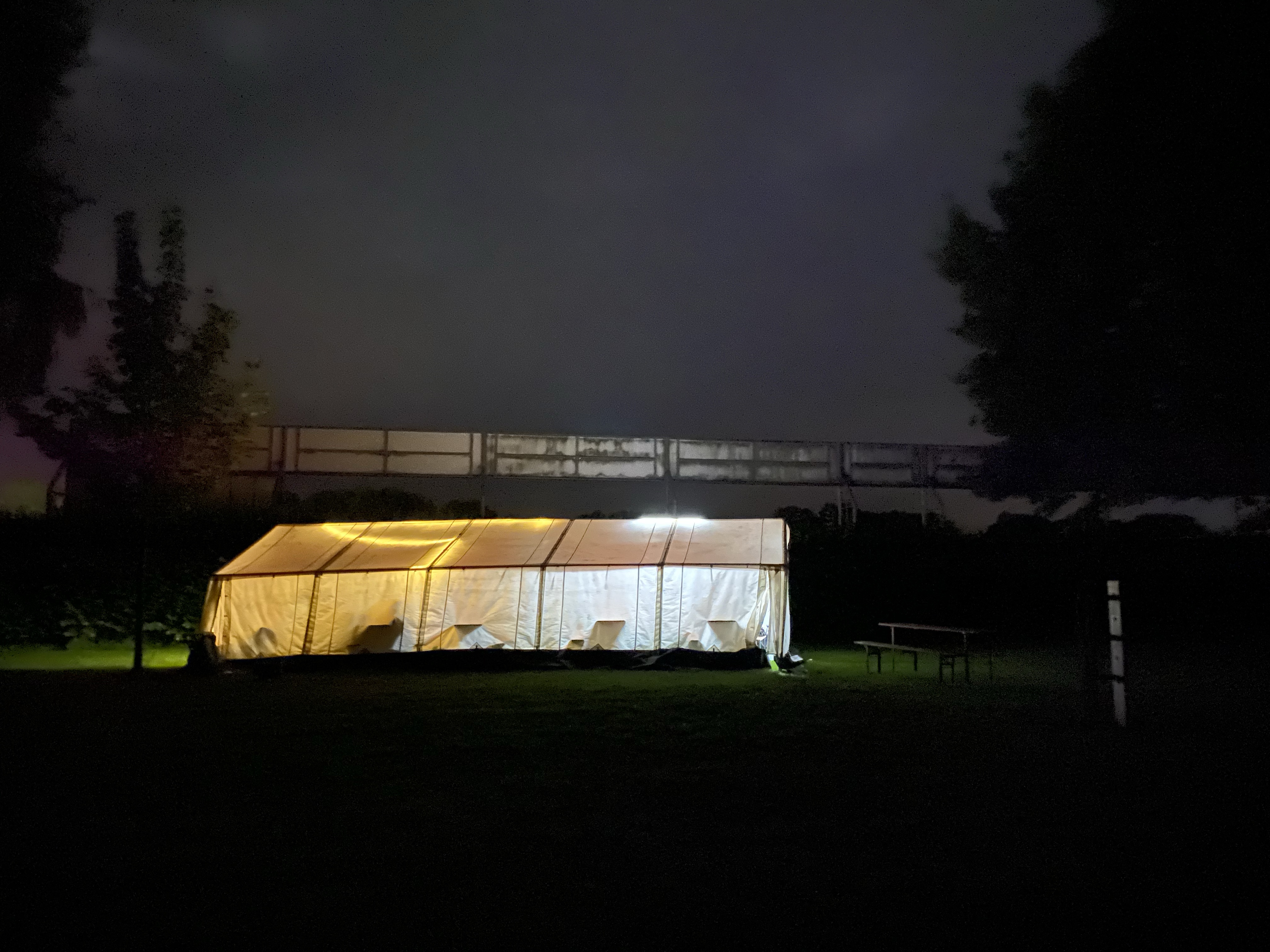 Oh nein, Regen! Immerhin konnten wir eben noch Sing-Sang machen. Jetzt haben sich alle in ihre Zelte und das Essenszelt verkrochen. Der TD sorgt für die passende Beleuchtung.