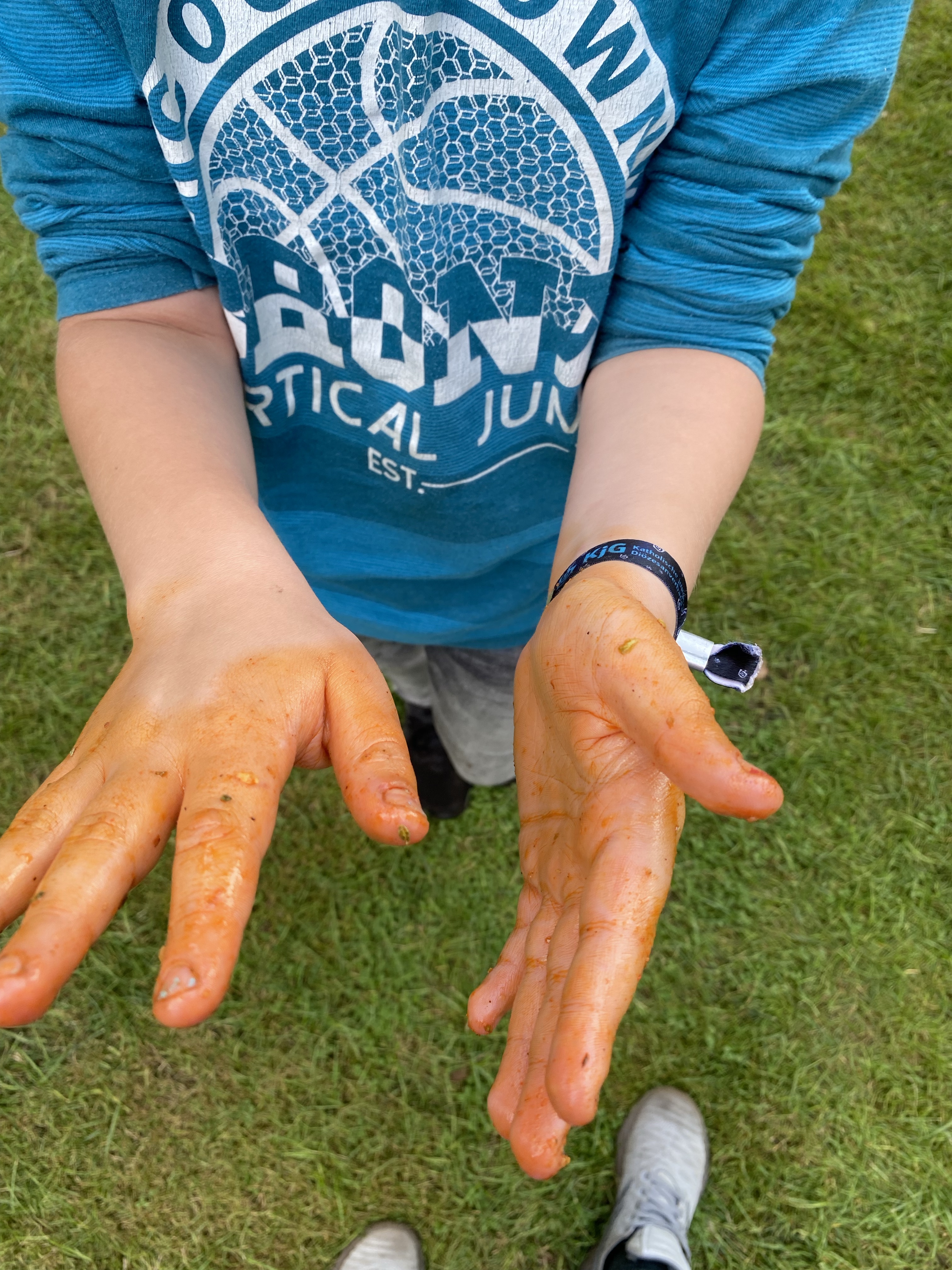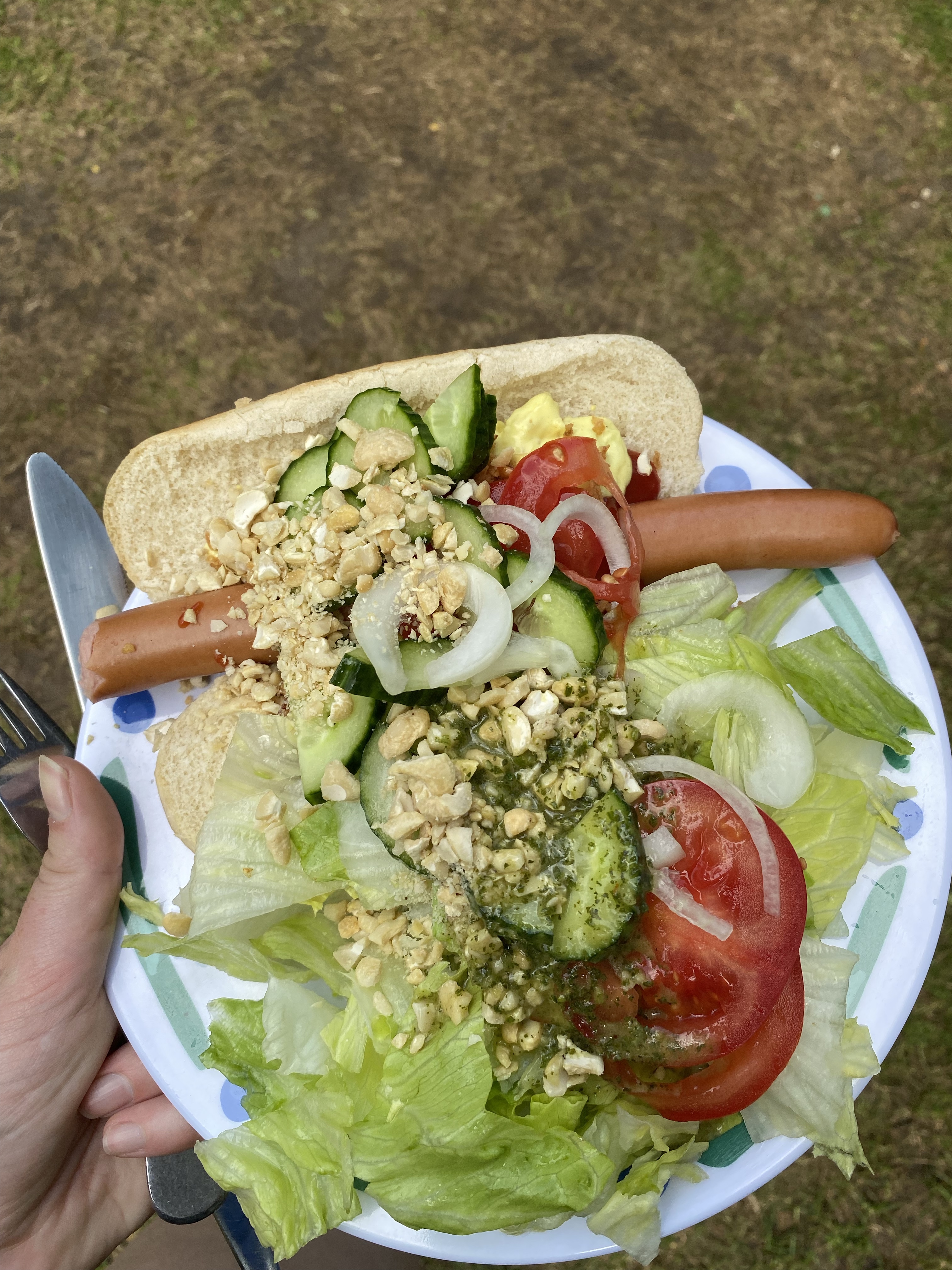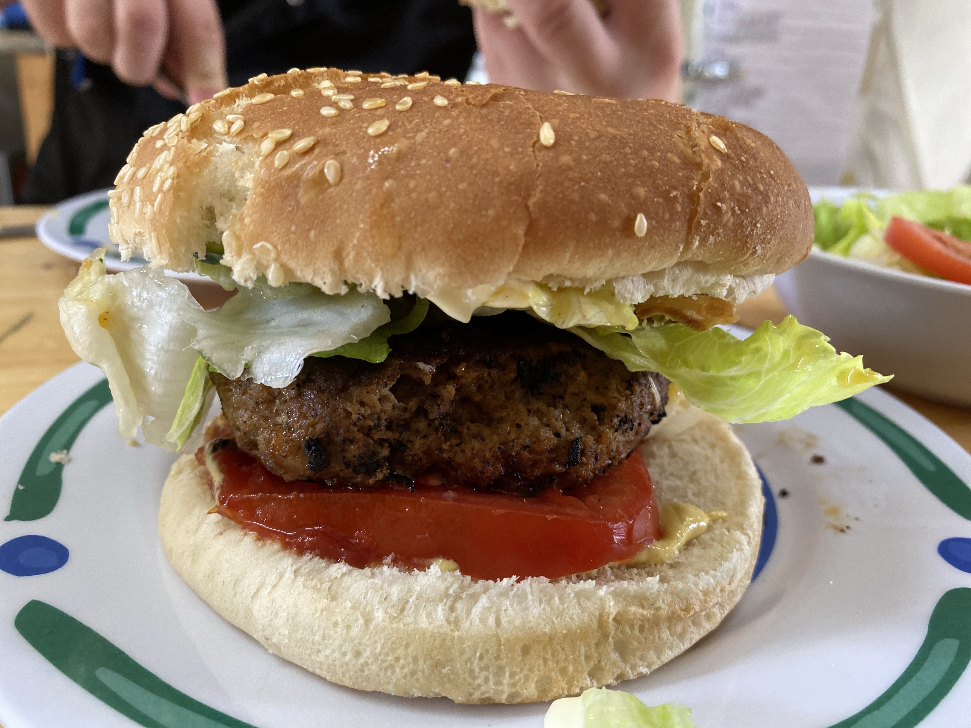 Die Kinder waren trotzdem sehr zufrieden: Fazit beim Lagerrat: 25 von 10 Sternen. ⭐️⭐️⭐️ Fazit für die Leiter*innen: wir gehen wahrscheinlich nochmal hin, trotz Aufwand. Dann aber mit doppelter Zeit – haben wir schon mit dem Schwimmbad abgeklärt – geht klar! Fazit 2: vom Beckenrand springen ist gefährlich und schmerzhaft, nicht ohne Grund verboten… Mit einer dicken Beule mit Kratzer, etwas Ausschlag und einem Splitter im Zeh, ging es gegen 13 Uhr zurück zum Zeltplatz und auf direktem Weg ins Essenszelt! HUUUNGER! Heute gab es Burger mit allem was das Kinder-Herz begehrt, in Vegan und in Fleisch. Fleisch ist hier irgendwie ein Dauerthema. Eigentlich wollten wir mal ein bisschen drauf achten weniger an die hungrigen fleischfressenden Pflanzen zu verfüttern, aber dann folgt die direkte Beschwerde beim Lagerrat! 😂