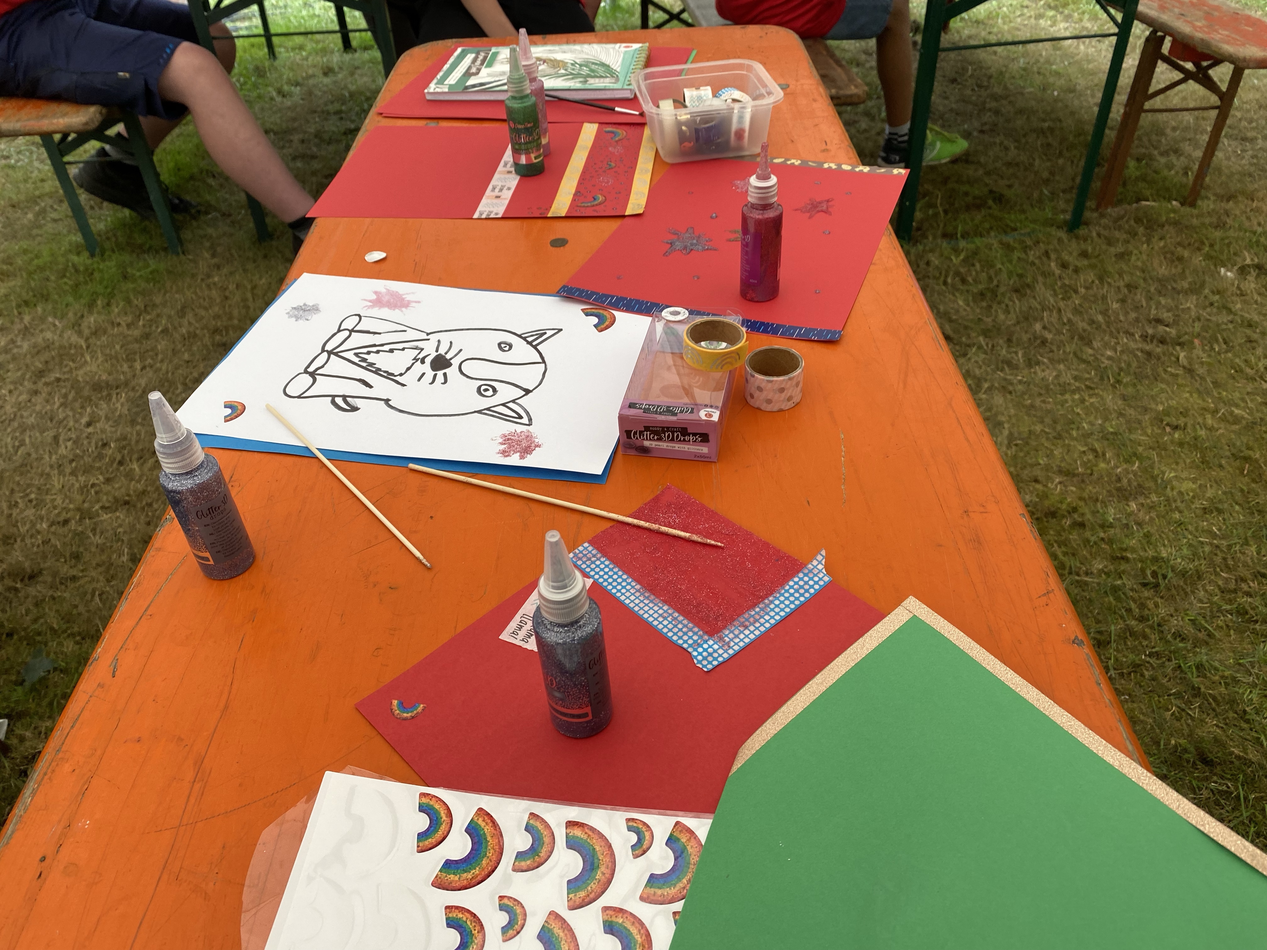 Gebastelt wurde auch reichlich, mit einem gewaltigen Glitzer-Unfall, der so traumatisiert hat, dass am Abend noch Glitzer am ganzen Kind klebte. Sein Bild hat mindestens genau so geglitzert und wird morgen noch mehr Glitzern – welche Stellen genau, wurden mir haarfein erläutert. Mindestens genau so erläutert wurde die Flagge/ das Klimarettungsplakat von der ältesten Jungsgruppe. Jede Gruppe hat ein weißes Stück Stoff und mal wieder alles an Bastelkram, was das TD Zelt hergab bekommen um für das Klima zu demonstrieren. Das Abendessen bestand heute aus Brot, Brötchen, dem gängigen Aufschnitt und – nicht Pudding – wie einige dachten. Es waren die Käsesaucen Reste vom Mittagessen, die durch den Kühlschrank eine puddingähnliche Konsistenz erreicht hatten und sich eins A als Aufstrich eigneten. Einige fanden es richtig gut, andere nicht so. Ich zu meinem Teil kann sagen, ich fand’s richtig gut. 🤷🏽♀️ Auch sowas, was ich am Zeltlager immer wieder richtig gut finde ist, dass jeder das sein kann und ausprobieren kann was er will, ohne direkt aufgehalten zu werden. Da kann man auch mal Mittagessen auf Brot zum Abendessen essen ohne schräg angeguckt zu werden, oder den halben Kramladen leerkaufen.