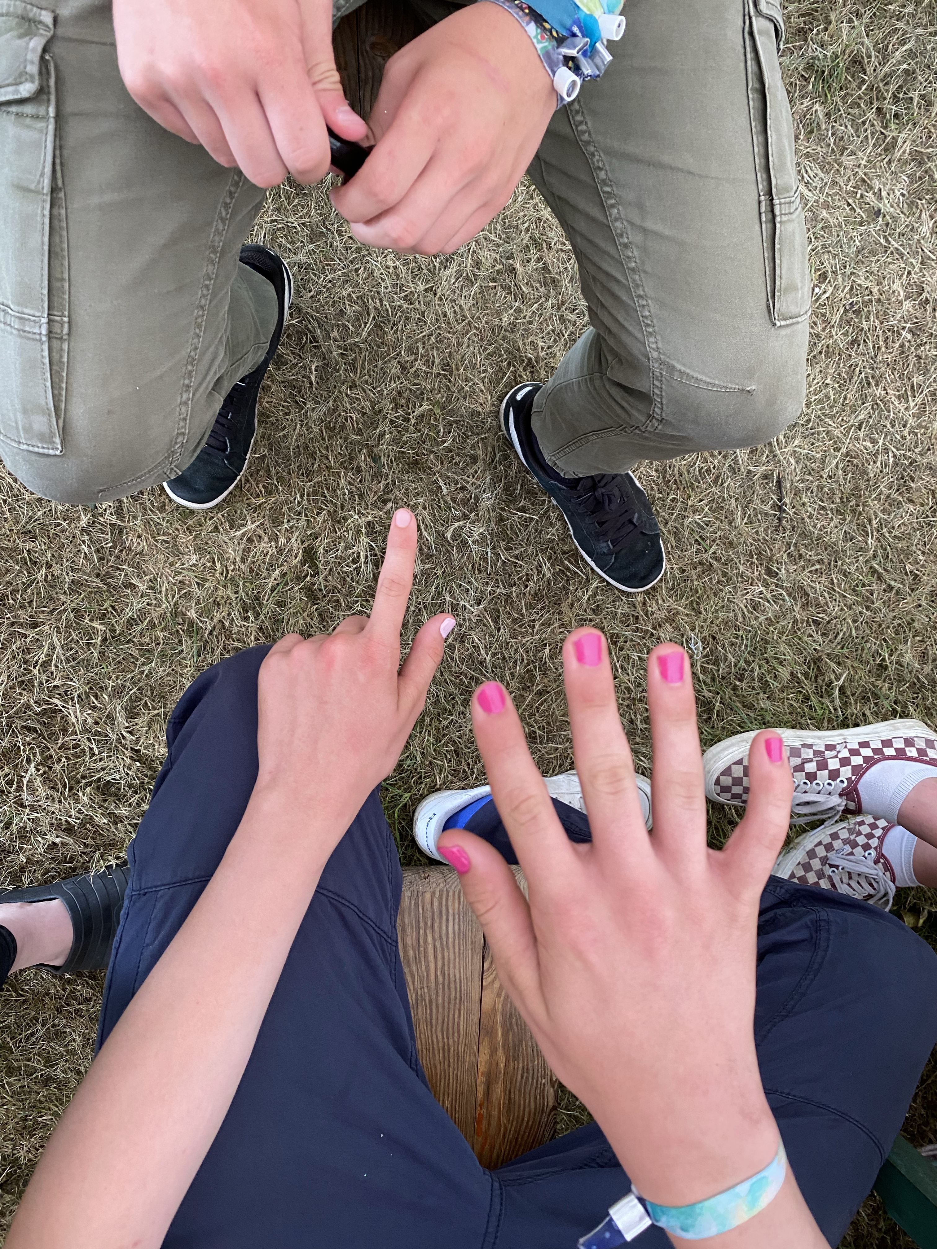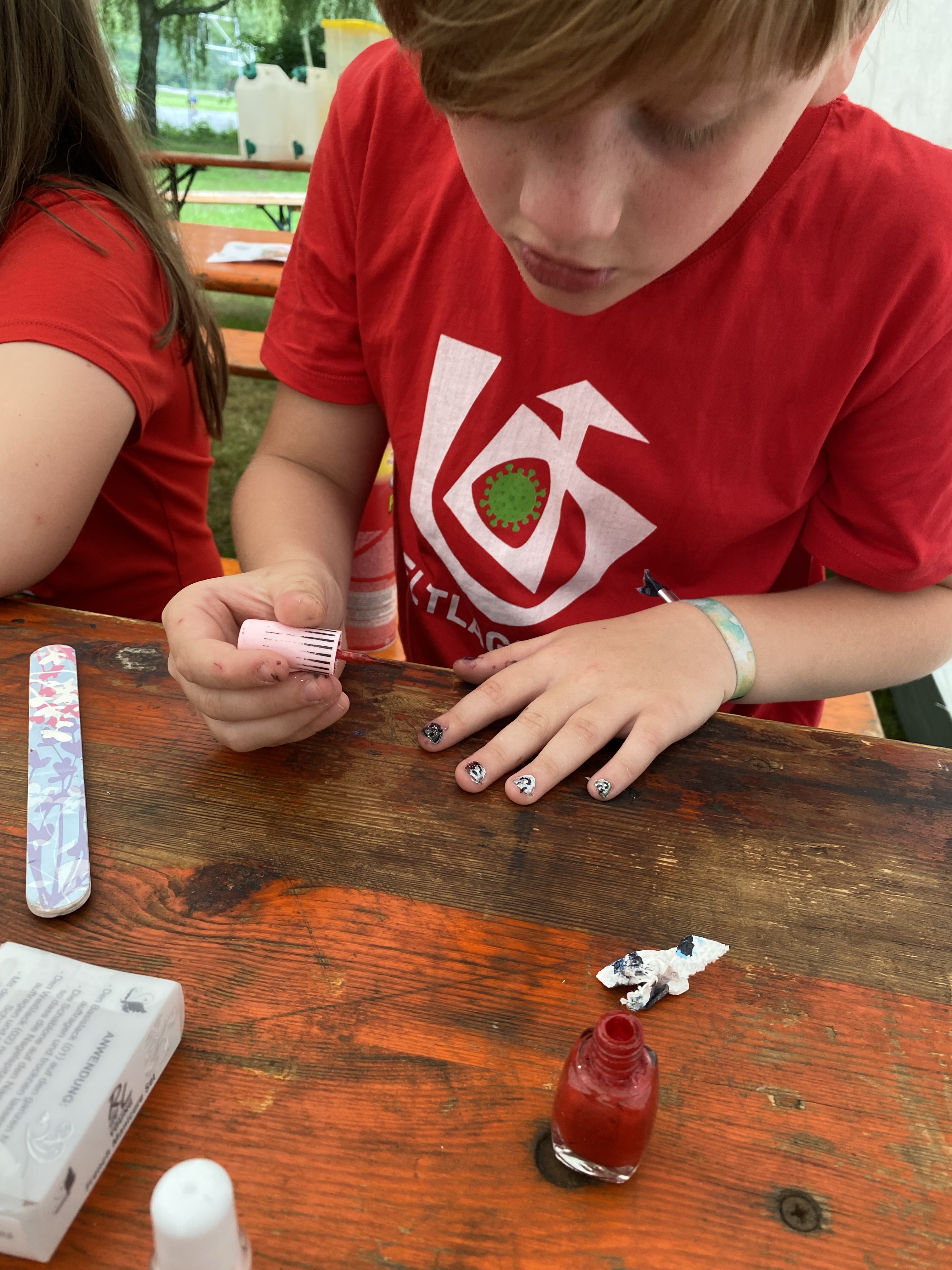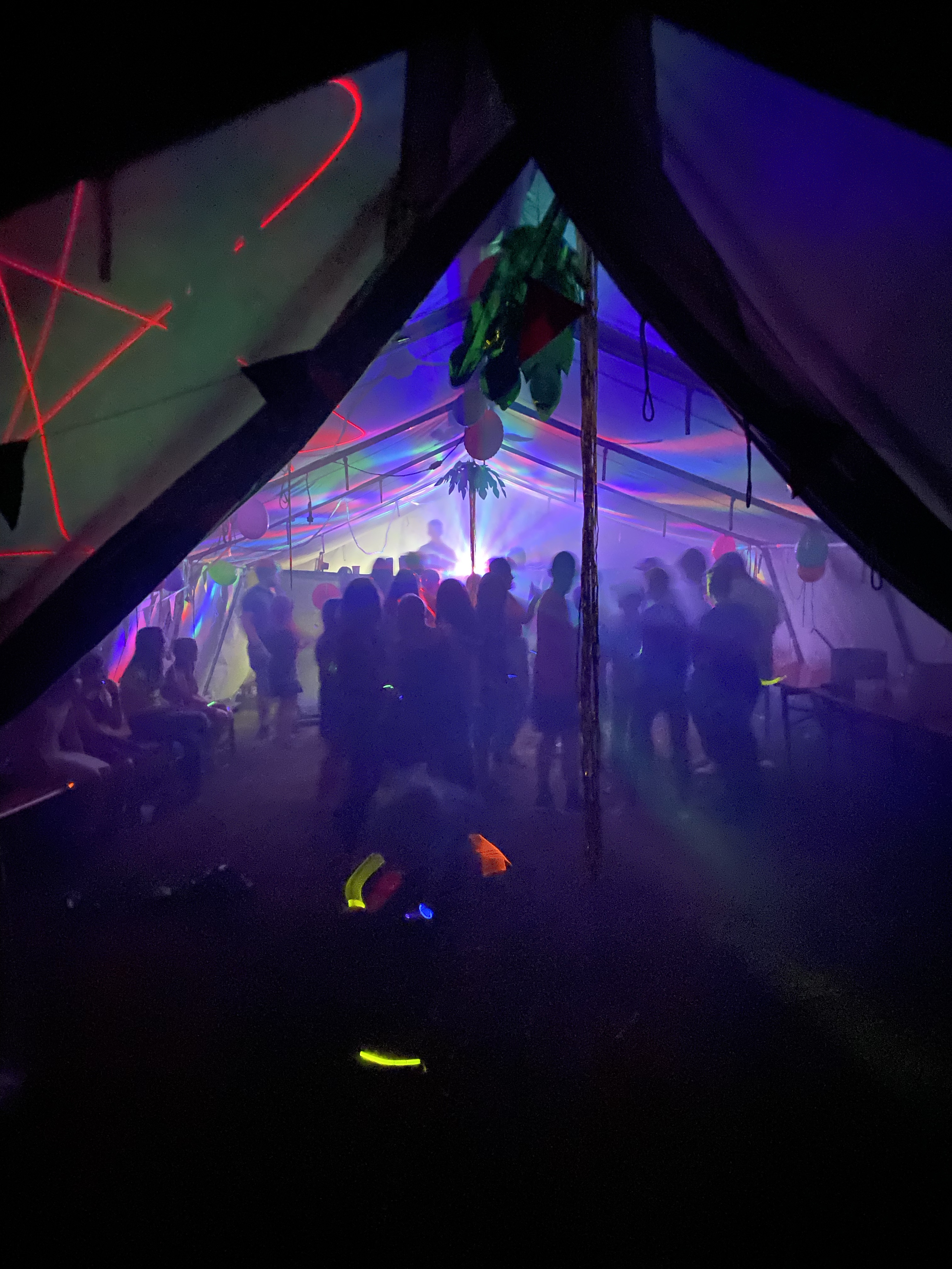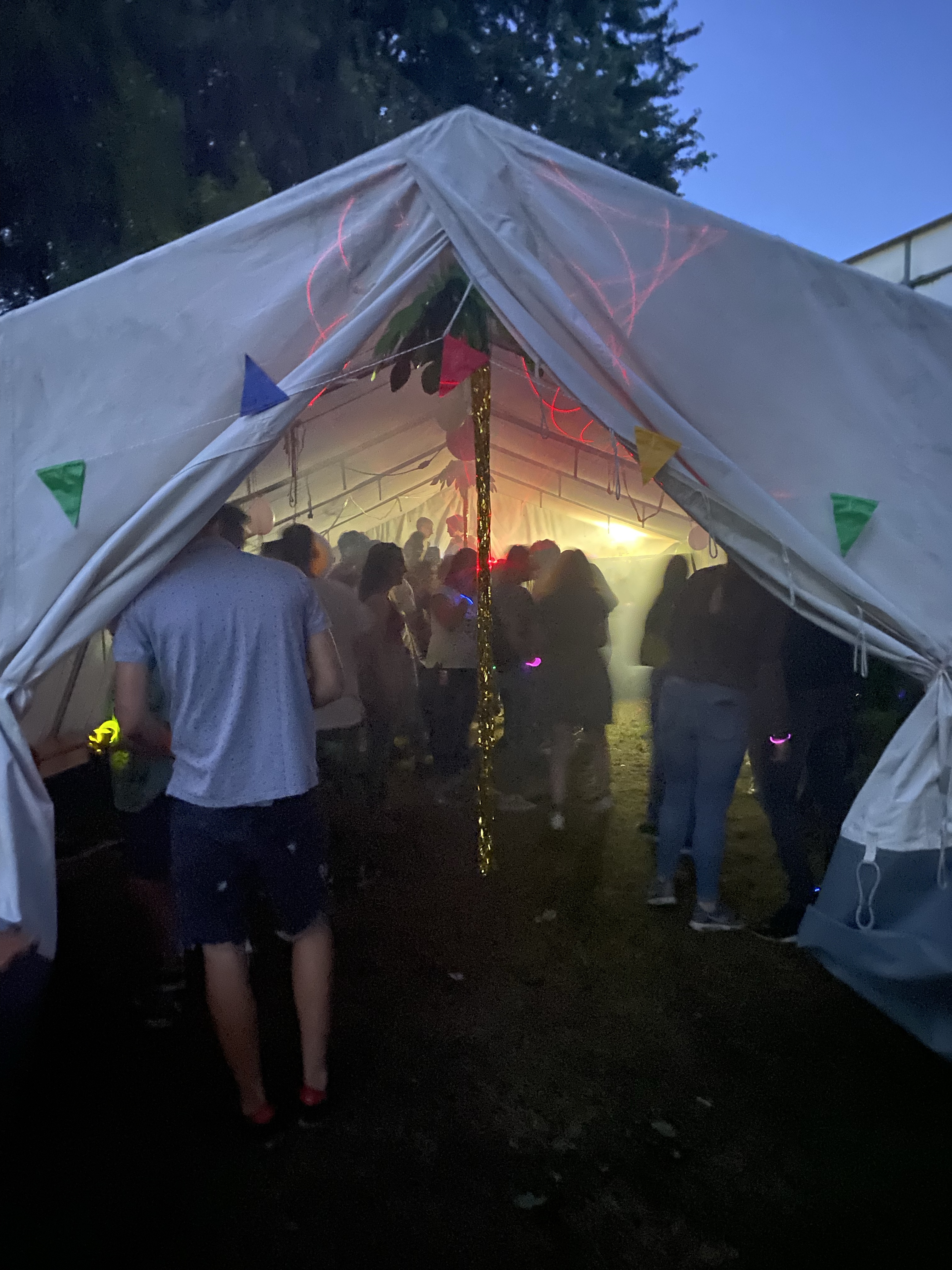 Gegen 18 Uhr wurden die Stände wieder geschlossen und aufgeräumt. Wir mussten uns ja wie gesagt alle auf die Disco vorbereiten. Es wurde geschminkt, Eyeliner gezogen, geglättet, frisiert und Pink gefärbt. Ich hatte nämlich Haarkreide dabei, die jedem nochmal ein besonderes Highlight in die Frisur brachte. Ab 20:30 Uhr ging dann die Party im Essenszelt ab! 💃🏽🕺🏼 Wir haben ohne Ende bis in die Morgenstunden getanzt… Naja bis halb 12, die Nachtruhe wurde etwas verschoben. Natürlich konnten die Kinder wenn sie zu müde waren auch schon früher ins Bett gehen. Und was soll ich sagen? Die Party war ein voller Erfolg, vor allem die älteren Kinder wünschen sich noch eine zweite. Ob wir den Wunsch erfüllen können? Ich glaube nicht, aber nächstes Jahr gibt es ja wieder ein Zeltlager.