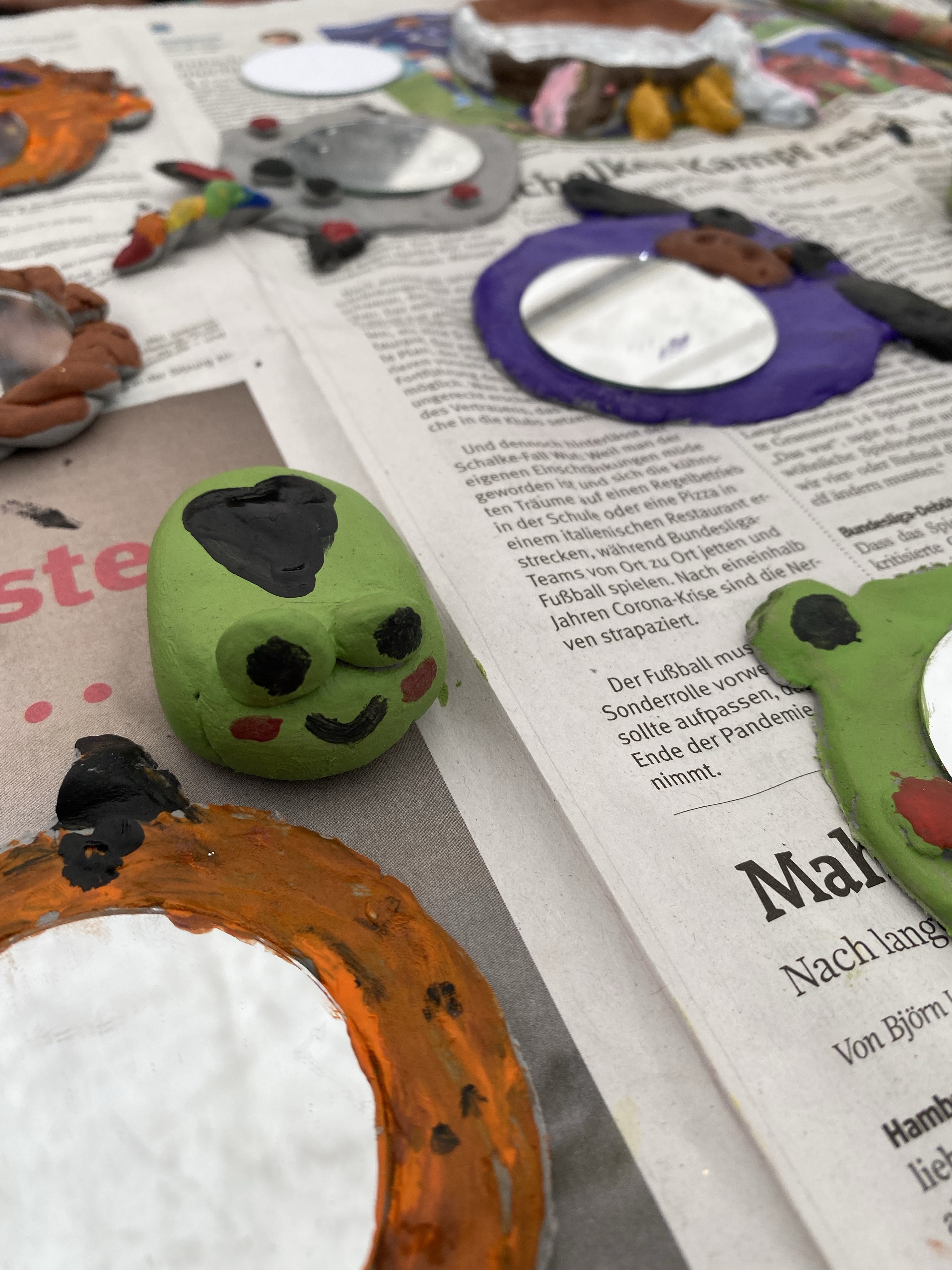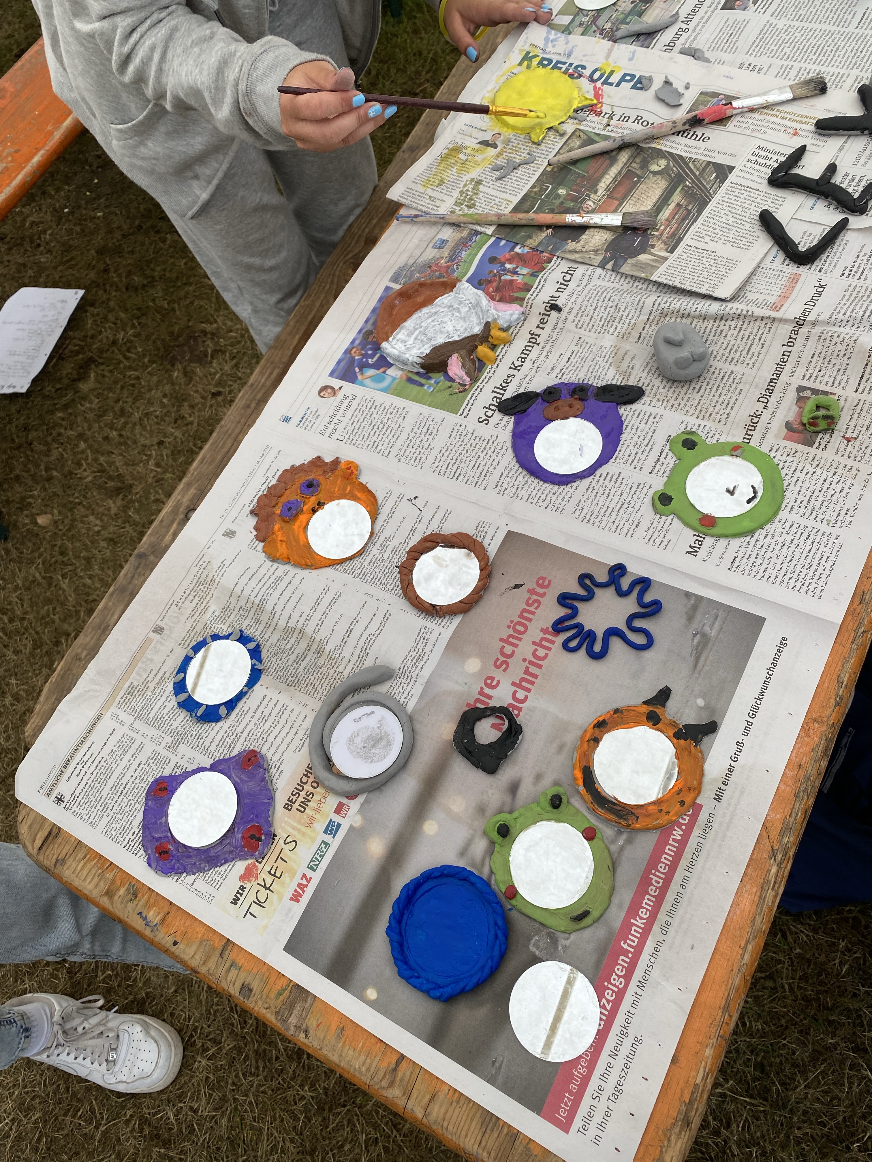 Zum Mittagessen gab es heute Currywurst mit Bratkartoffeln und einem bunten Salat. Dann freute sich die Spülmaschine gefüttert zu werden und der Jahrmarkt wurde aufgebaut. An verschiedenen Ständen konnten die Kinder Zuckerwatte, Crepes oder Popcorn holen. Außerdem gab es eine Schokokusswurfmaschine, Dosenwerfen und „Pie Face Duell“, bei dem einem der Teilnehmer irgendwann Sahne ins Gesicht geschleudert wird – richtiger Nervenkitzel! 😵😂 Eventuell ereilte einigen Kinder ein klitzekleiner Zuckerschock. Das Oberhighlight war aber Domenika Eldura, unsere Wahrsagerin! Hier wurd der neuste Gossip getratscht und die Liebe vorausgesagt! 🤭