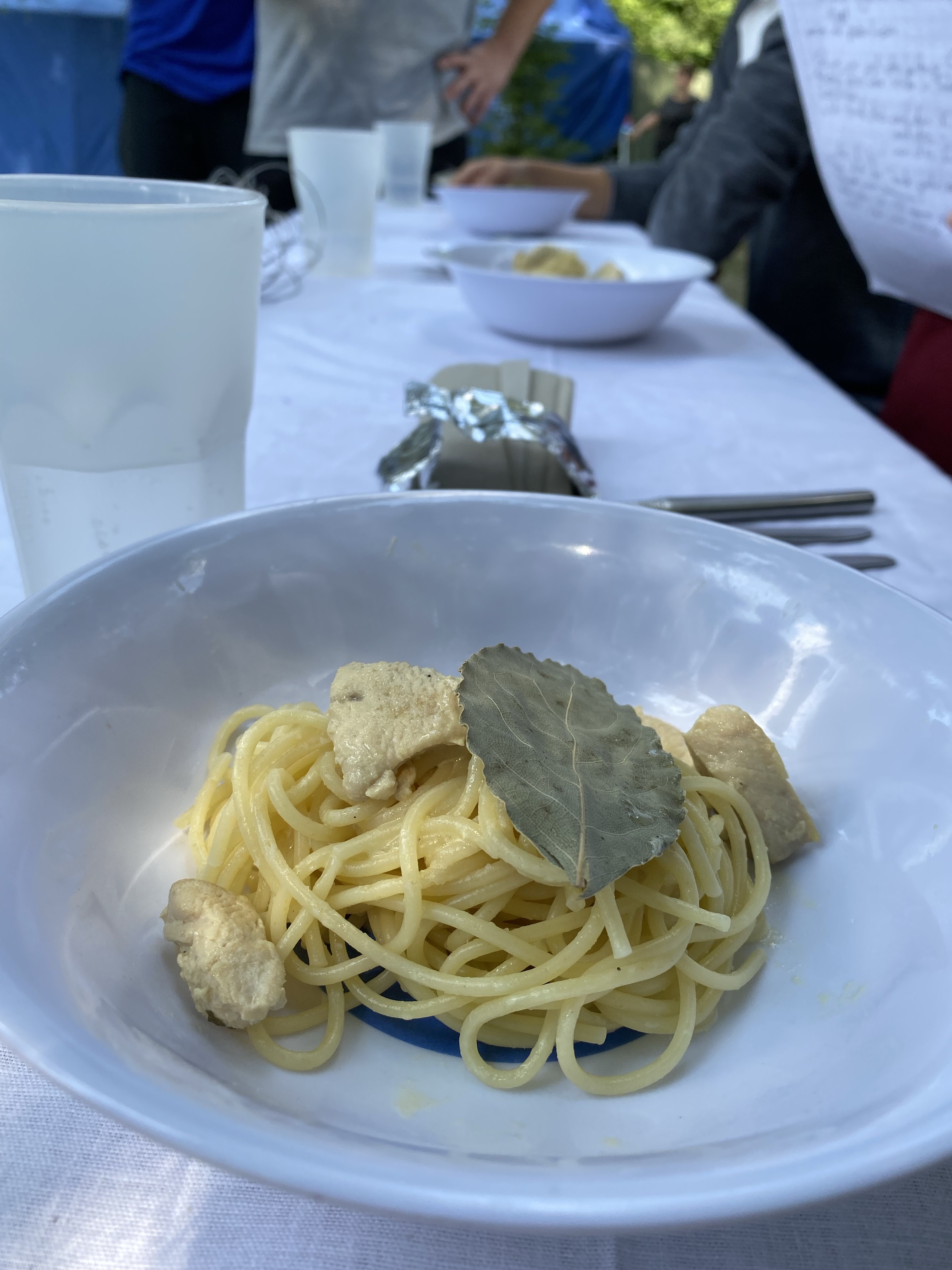 Die Kinder haben ihre Zelte bezogen und sich erstmal eingerichtet. Danach haben sich alle in den Gruppen getroffen, einen Lagerrat gewählt und ein bisschen gespielt. Gegen Abend lauerte der Hungertod – uns wurden mal wieder die Haare vom Kopf gegessen. Food of the Day: Spaghetti mit Tomatensauce und Salat mit Gurke und Sauce. Ein guter Start, finde ich! 😋