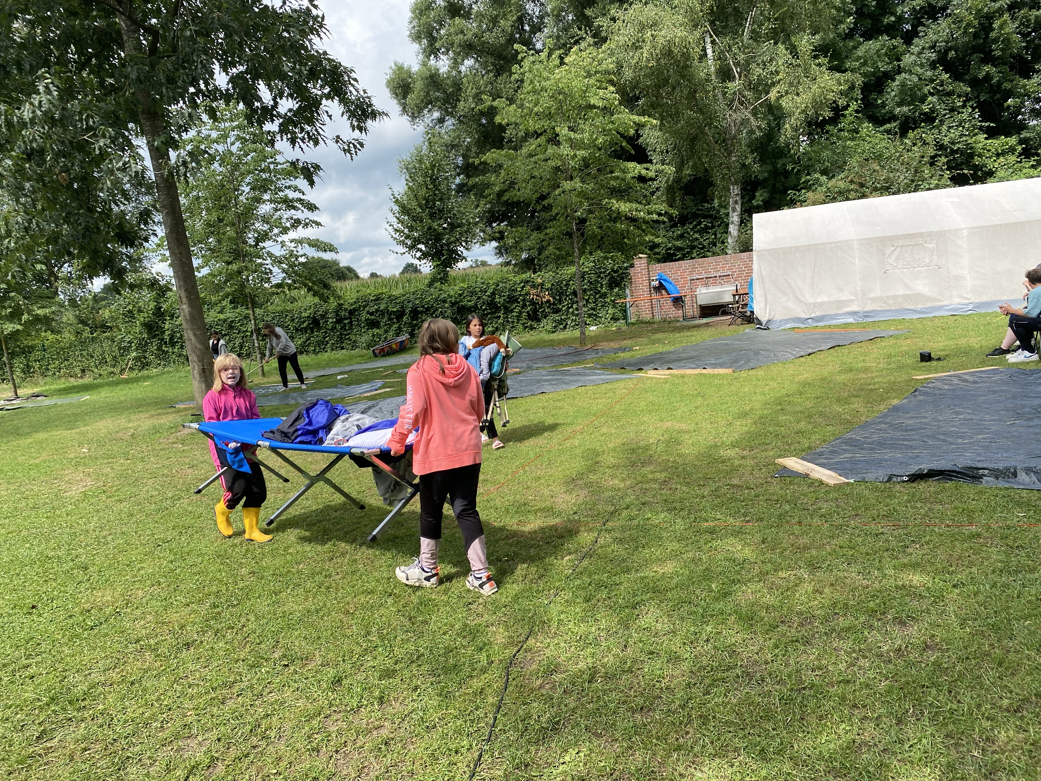 Das ist alles was nun noch steht. Dann war es an der Zeit die Zeltböden und Planen zu schrubben, zum Glück mit Tatkräftiger Unterstützung der Kinder!