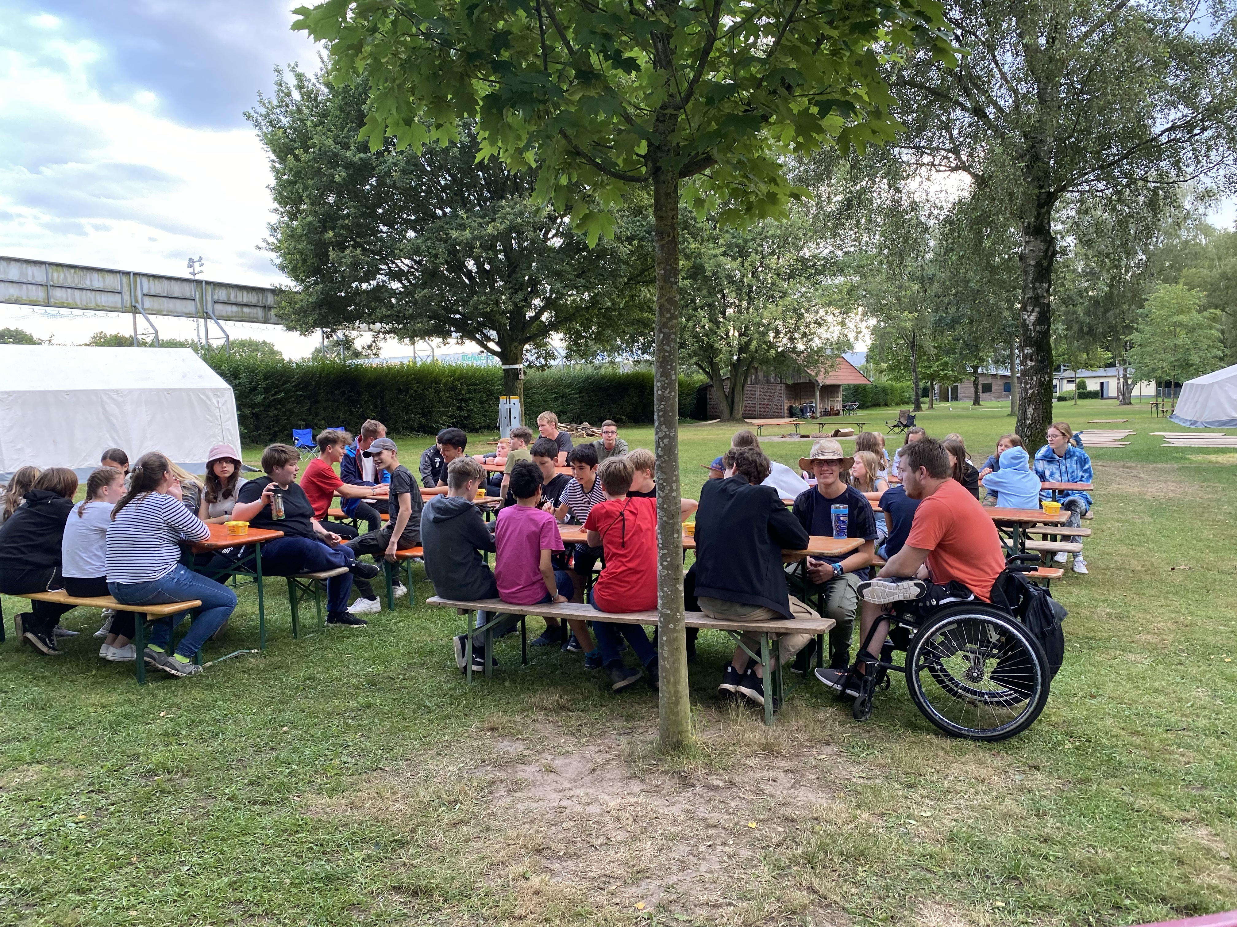 Wie heute morgen schon erwähnt gab es heute Chilli, mit Schokolade zum Mittagessen und eine ganz schön gespaltene Meinung über das Essen. Etwas ungewöhnlich, statt Fleisch Linsen, Schokolade und Bohnen? Also ich fand es lecker – manchen fehlte „der Kick“ vom Fleisch. 🍖 Vom Fleisch gefallen ist jedenfalls niemand. Nach dem Mittagessen und den Diensten folgte das nächste Spiel: Henning und Marco gegen den den Rest der Welt ooooder eher das Zeltlager. In verschiedenen Spielen sind die Kinder gegen die beiden angetreten. Heute standen Dribbeln, Hochhalten und Elfmeterschießen auf dem Spielplan. In den nächsten Tagen wird es immer wieder Duelle geben. 🏆