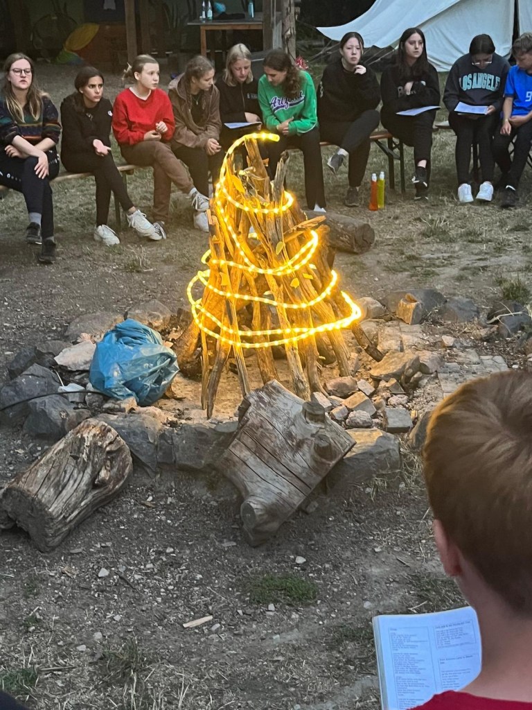 Zum Abend die traurigste aller Nachrichten, die man im Zeltlager erhalten kann. Trotz des Regens Waldbrandgefahr: wir dürfen vorerst kein Lagerfeuer mehr machen. 🥲 Egal, der TD hat uns aber kurzerhand was gebastelt (siehe unten).