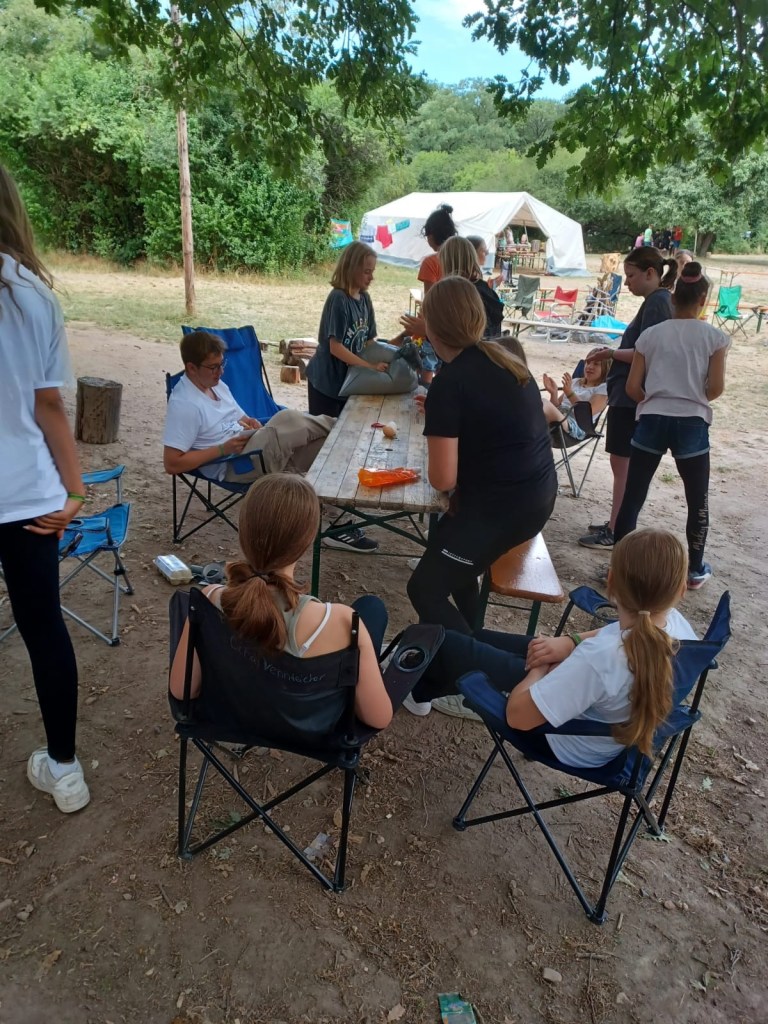 Nach dem Frühstück und dem Spüldienst startete das Programm in der Kreidezeit mit der Suche nach den Dinoleiter*innen im Schlosspark nebenan. Nachdem alle Dinos wieder eingesammelt waren und der Asteroid für die Auslöschung gesorgt hat, bekamen die Kinder schon eine neue Challange: an verschiedenen Stationen verteilt auf dem Zeltlplatz mussten sie Quiz-Fragen quer durch die Epochen beantworten, verschiedene Geschicklichkeitsaufgaben unter Beweis stellen und und .