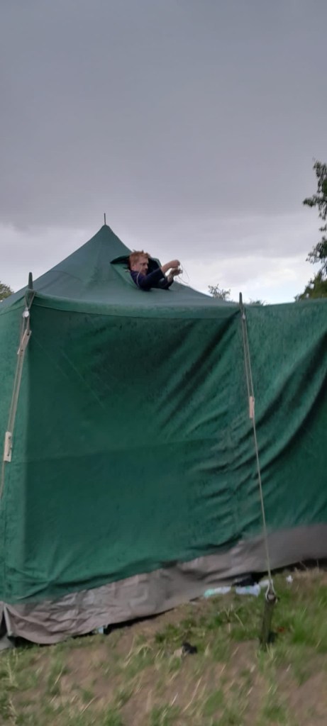 Aber naja der Regen kam phasenweise wieder und hat uns beim Abbau leider ordentlich gestört. Egal wir kennen das schon. Dann bauen wir die Zelte eben in Drolshagen wieder auf. Also: die Kinder haben heute ihre Sachen gepackt: die jüngsten Jungs haben sogar sehr früh angefangen und eben auch als letztes aufgehört. Gegen Mittag lagen dann die Kinderzelte. Heute wird nämlich nochmal zusammen eine Übernachtungsparty veranstaltet: die Mädchen schlafen im Essenszelt, die Jungs im sogenannten „Dosenzelt“ und die Leiter zusammen im Küchenzelt.Also nochmal eine aufregende Nacht.