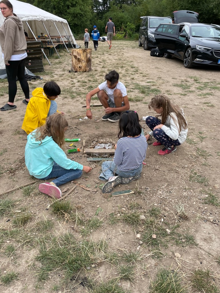 Mit einer Geschichte von Ayleen und Timo G. Ging es direkt los: Auf dem Weg nach Wiesbaden ist das Flugzeug abgestürzt. Zum Glück ist kein Kind zu schaden gekommen, aber die Flugzeuge sind in Stücke zerbrochen. Die Gruppen mussten die Flugzeuge, in Form von Zetteln, auf dem Zeltplatz suchen. Und die Verstecke hatten es in sich! Lenni musste vor allem den ältesten Jungs bei der Suche nach ihrem überlebenswichtigen Flugzeug helfen. 🤭
