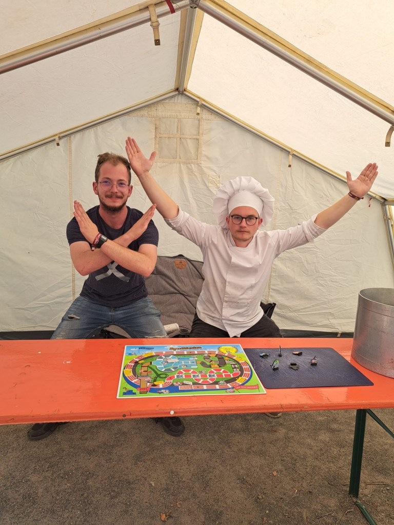 Zurück im Lager angekommen wurde sich weiter ausgeruht und gestärkt. Es gibt Gulasch. Das Essenskonzept dieses Jahr ist echt ausgeklügelt. Die Hauptmahlzeiten sind häufig vegetarisch und ohne Fleisch: heute zum Beispiel war der Gulasch rein pflanzlich. Klingt für den ein oder anderen lang eingesessenen Fleischesser erstmal komisch… Aaaaber es hat so gut geschmeckt. Ich glaube das ein oder andere Kind hat gar keinen Unterschied gemerkt. Wir danken der Küche für das gute Essen!!! (SCHLEIMER!)