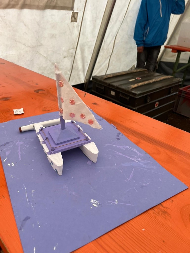 Jede Gruppe durfte jetzt einen Katamaran aus Holz bauen und bunt anmalen. Wirklich spaßig. Manche Kinder sind wirklich handwerklich begabt. Nach dem Abendessen kam dann wieder die Sonne raus. Die Kinder wollen aber unbedingt noch einen Film gucken und sich diesen selbst aussuchen. Ok, dann machen wir das eben so. Gerade läuft der Film „Eiskönigin 2“, mal gucken ob jemand Textsicher ist.
