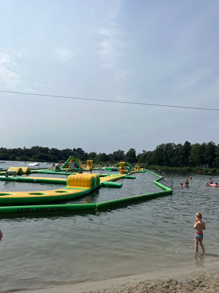 Und so hat es auch unseren Kindern gefallen. Zitat Jan: „Echt toll, Norsee-Feeling“. Wir verbrachten bis 16:30 den Tag am See. Und die Kinder kamen wirklich auf ihre Kosten. Sogar eine Stunde Aquapark war drin! Darunter kann man sich einen großen, aufblasbaren, auf dem Wasser schwebenden Parcours vorstellen mit Rutschen, Trampolinen und einem Luftkissen.