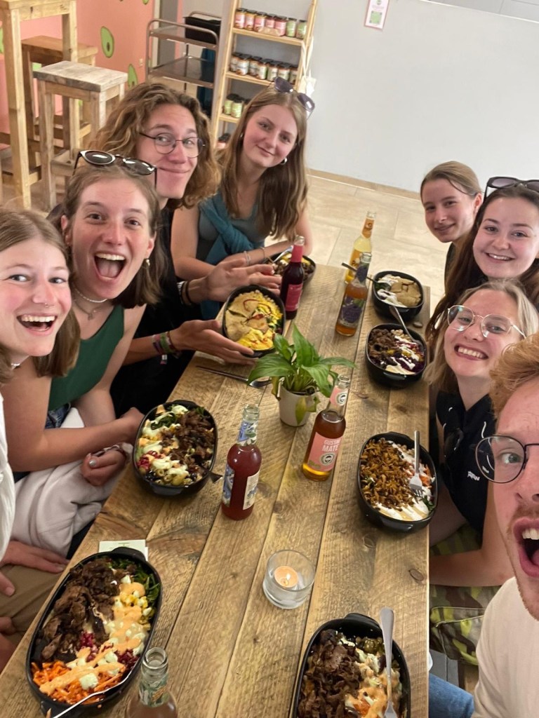 Nach der Aktion gab es dann Mittagessen. Und zwar Burger. Jedes Kind konnte sich so seinen Burger selbst zusammenbauen. Es gab Burgerbuns, selbst von der Küche hergestellte Pattys und vegane Alternative, viele Soßen, Gurken, Tomaten, Käse und vieles mehr. Anscheinend ist das Essen wieder sehr gut angekommen. Die Kinder haben unserem Küchenteam auf jedem Fall die Haare vom Kopf gefressen. Selbst das Team, dass das Essen ausgeteilt hat musste um die letzte Bulette kämpfen.