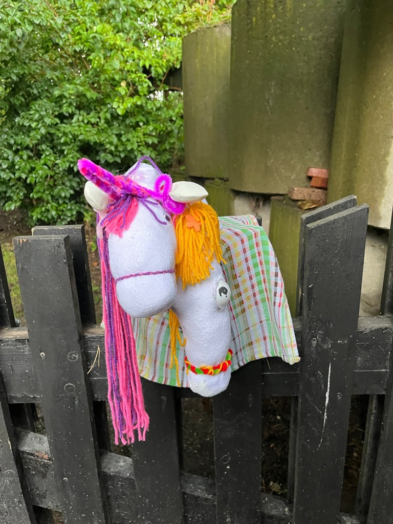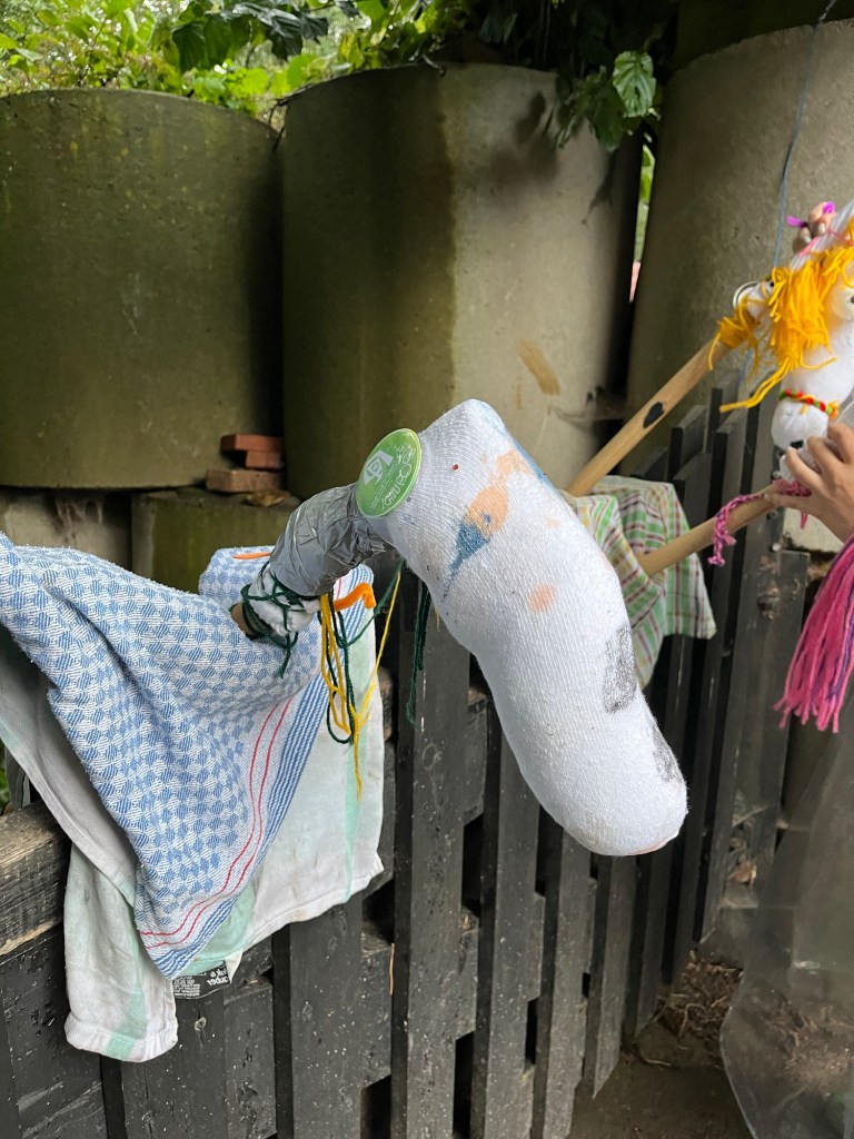 Das Nachmittagsprogramm wurde nämlich wetterbedingt kurzfristig umstrukturiert. Statt draußen ging es im Essenszelt weiter: jede Gruppe hatte die Aufgabe ein Pferd zu basteln, welches am Abend präsentiert und in einem Hobbyhorsing-Wettbewerb der Jury zur Schau gestellt wurde.